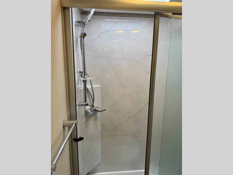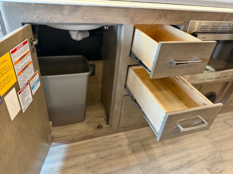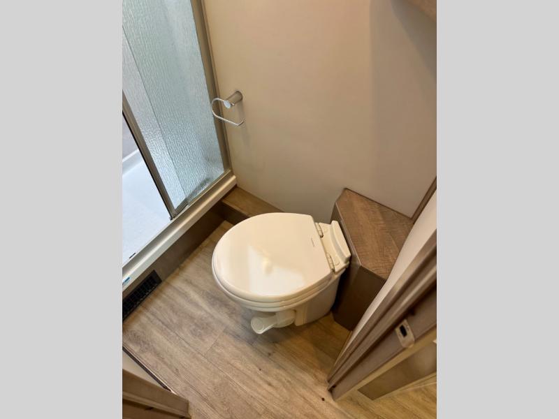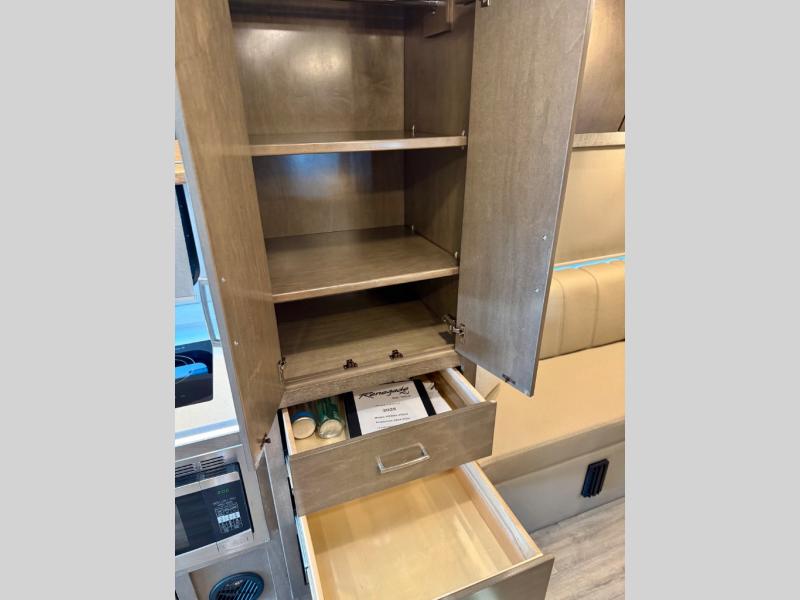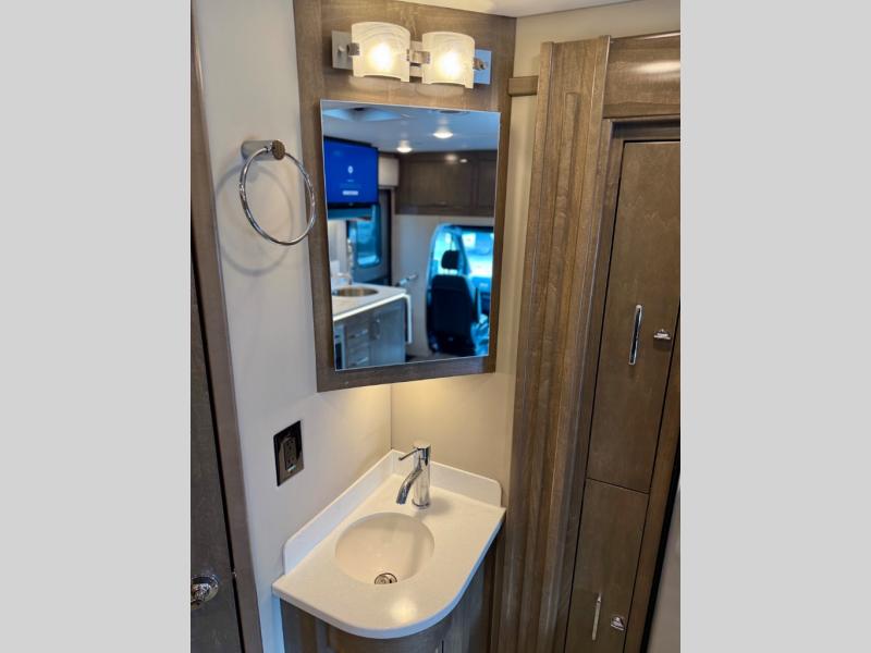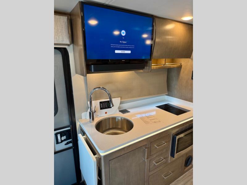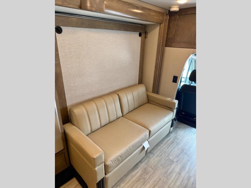 This motorhome offers flexibility and comfort! An L-sofa with storage provides room to relax in the rear corner, or sit on the jiffy sofa towards the front. At night you will enjoy sleeping on the 65" x 72" Murphy bed. The rear corner bath includes a sink outside the door for flexible use. The kitchen features an 8 cu. ft. refrigerator, microwave, and pantry, plus a closet to store miscellaneous items. Step outside and enjoy the exterior entertainment center with a 27" TV, soundbar with Bluetooth streaming, and USB charging!
