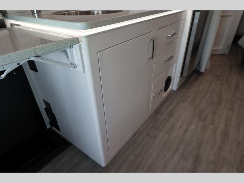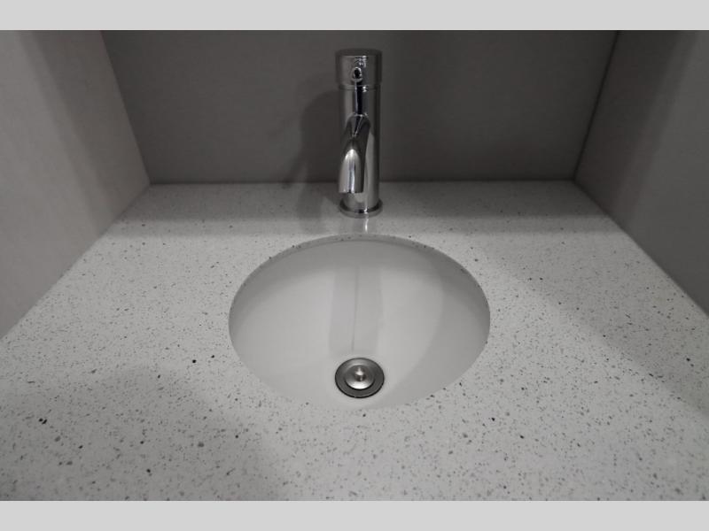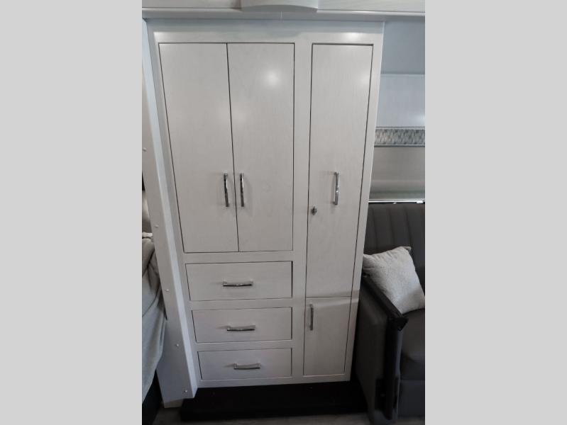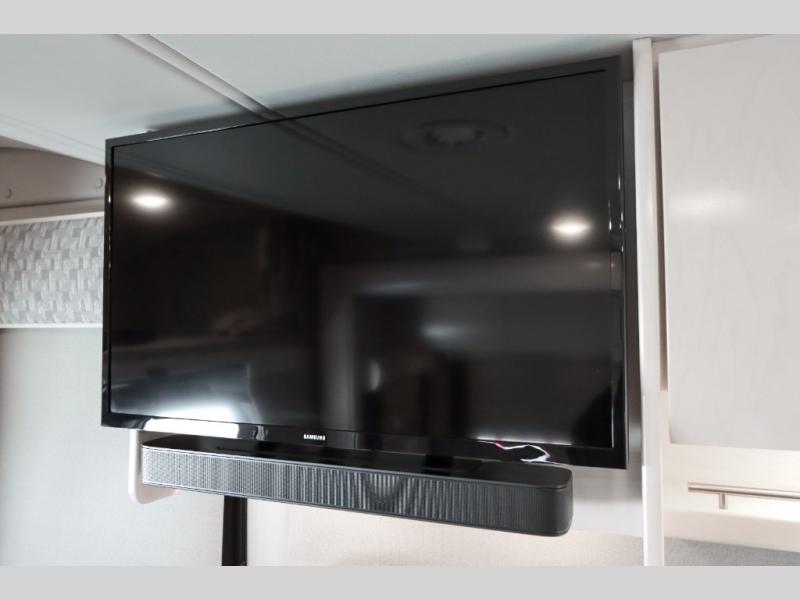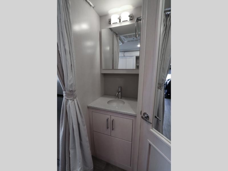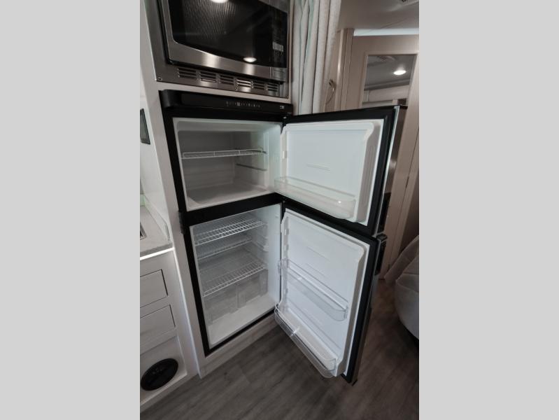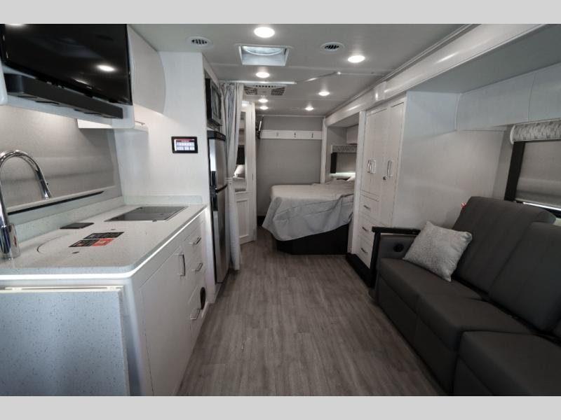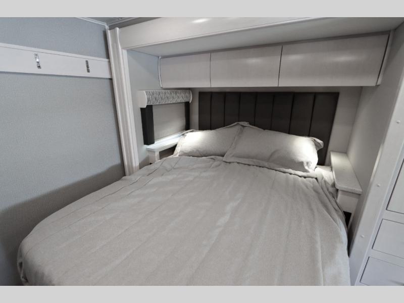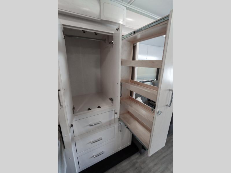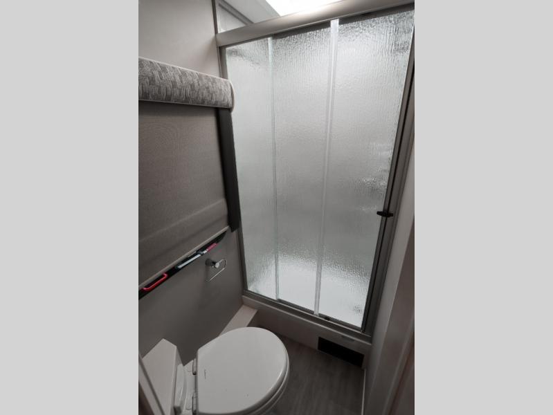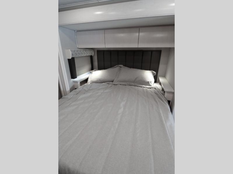 You will have a luxurious experience traveling in this motorhome! After a long day of traveling, you can either take a hot shower in the rear corner private 24" x 36" shower and toilet room, or lay down on the RV queen bed within the large slide. The bathroom sink is just outside the door with a medicine cabinet to store your toiletries. There is plenty of storage throughout between the wardrobe, the overhead cabinets, and the pantry, as well as outside with side swing baggage doors. The dinette is a great place to enjoy meals, play games, and transform into a sleeping space, and with a 46" x 80" bunk mattress above the cab, another person can join in on the fun!