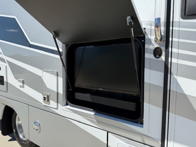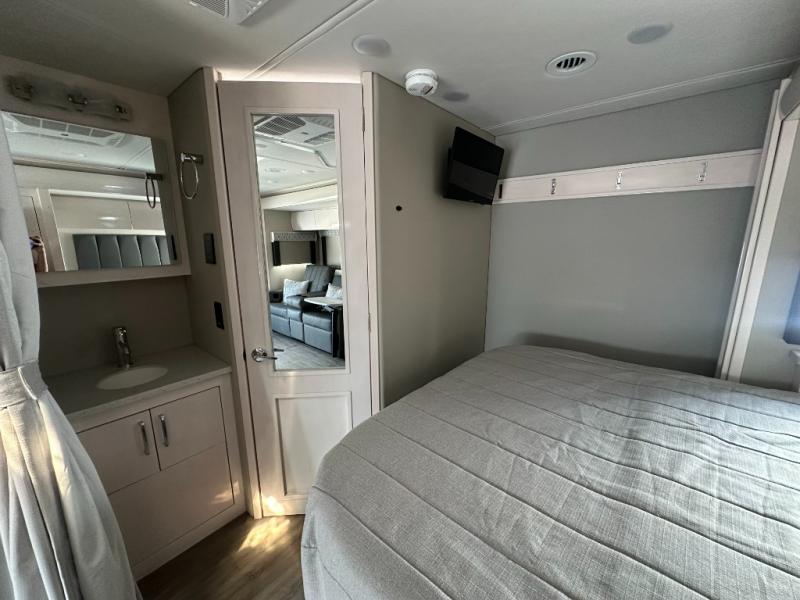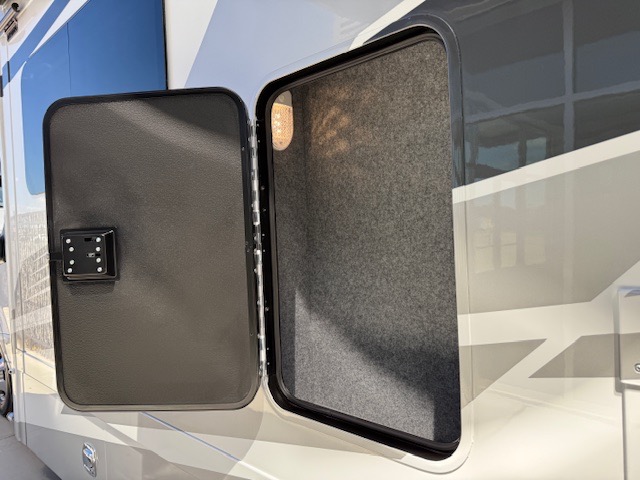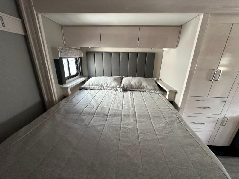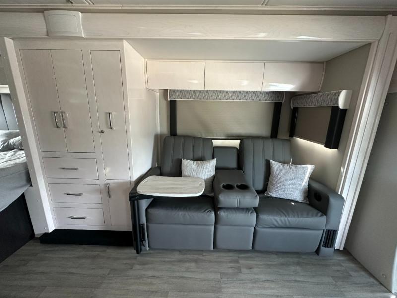 You will have a luxurious experience traveling in this motorhome! After a long day of traveling, you can either take a hot shower in the rear corner private 24" x 36" shower and toilet room, or lay down on the RV queen bed within the large slide. The bathroom sink is just outside the door with a medicine cabinet to store your toiletries. There is plenty of storage throughout between the wardrobe, the overhead cabinets, and the pantry, as well as outside with side swing baggage doors. The dinette is a great place to enjoy meals, play games, and transform into a sleeping space. And you might like to add the cab table option so you have a place for your morning coffee while sitting in the front seats.