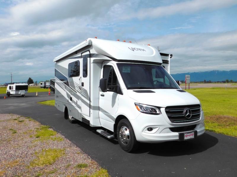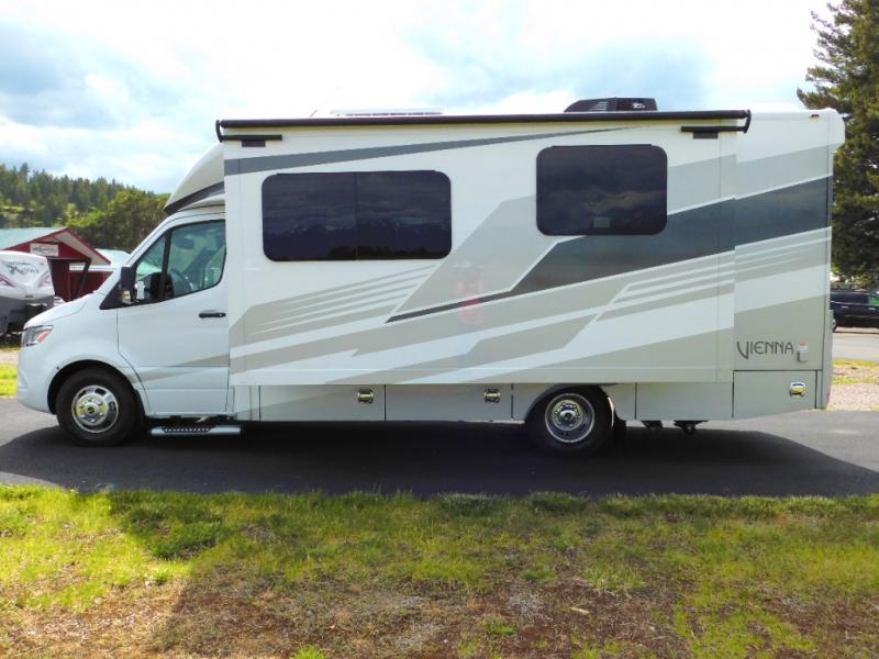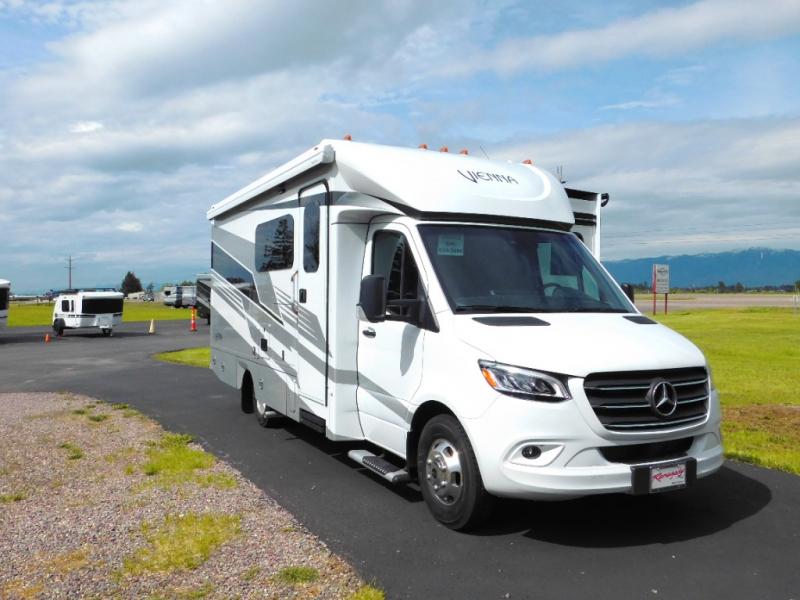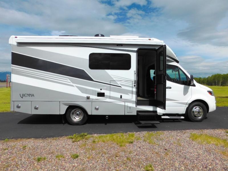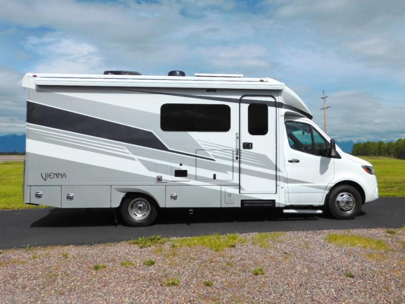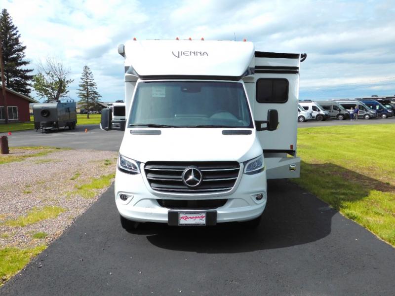 Luxury is in the details of each one of these Renegade Vienna Class C diesel motorhomes! They are built on a Mercedes-Benz Sprinter chassis, and include a four point hydraulic leveling system with app control, a 2000w true sine wave hybrid inverter, a 3.6KW LP generator with auto gen start, and Winegard Connect 2.0. You will appreciate the Truma™ Comfort Plus tankless water heater when showering, the accent lighting at the galley countertop for style, and the USB charging in the living area, bedroom and kitchen to keep your electronics ready. The Maple hardwood cabinetry completes the luxurious décor throughout the inside. Make your selection today!