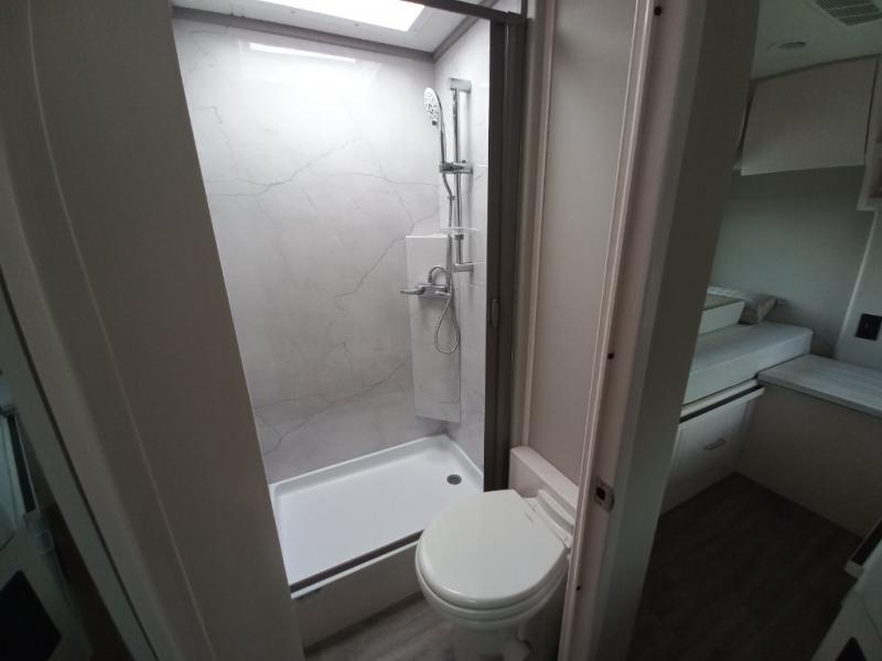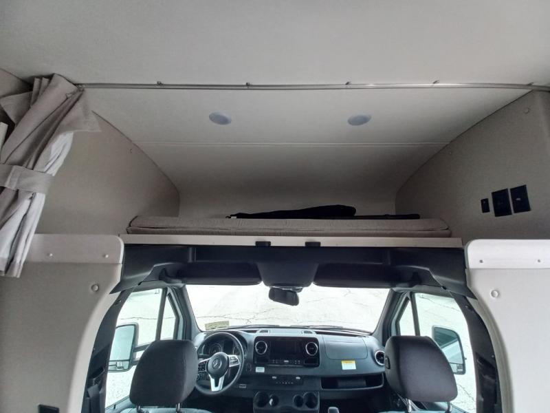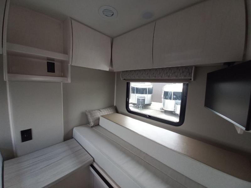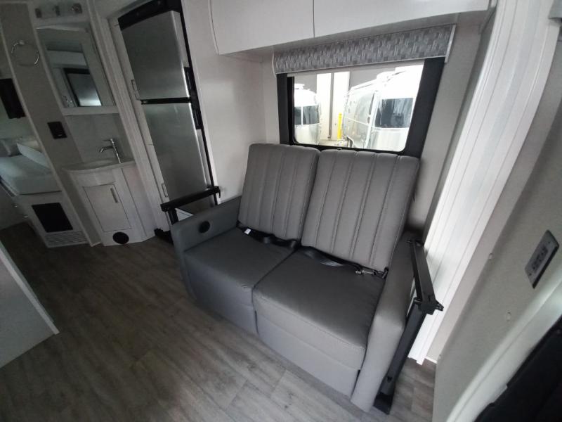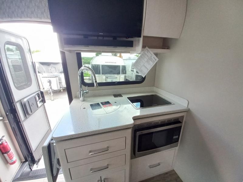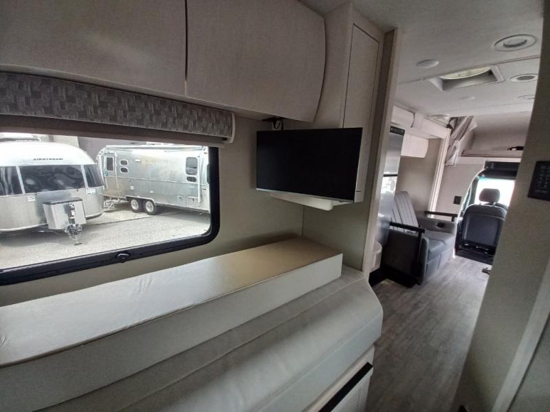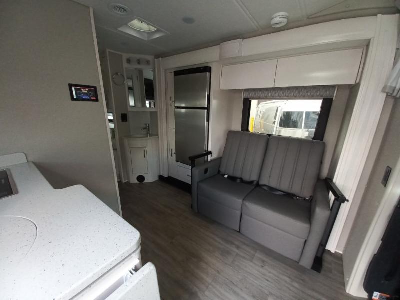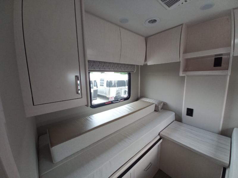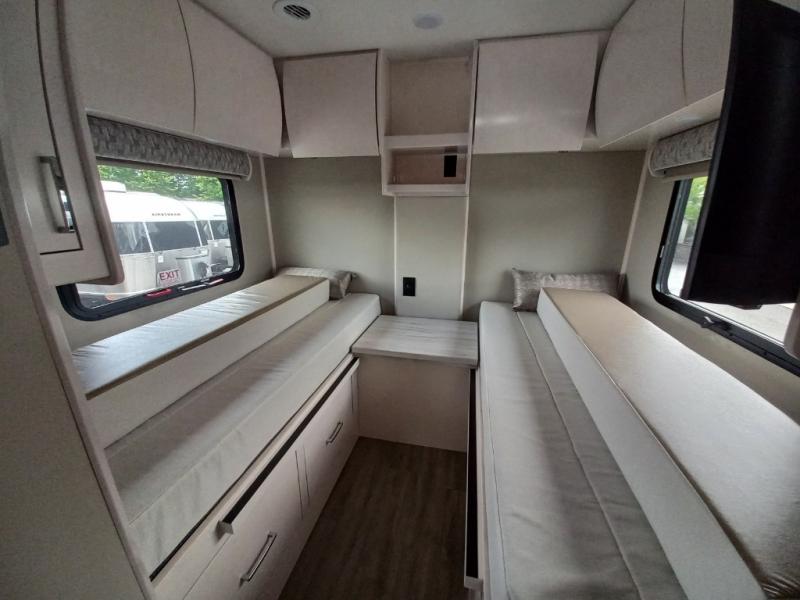 The perfect coach for two along with room for an added guest or little ones with the 46" x 80" over the cab bunk! You will appreciate the storage throughout for your belongings, so no worries about leaving anything behind. The single slide out along the driver's side adds more walking around space inside. Prepare light meals and snacks with ease while you travel with a two-burner cooktop and round sink for cleaning up. There is cupboard storage in the overhead areas for your dishes, and the refrigerator/pantry is located opposite within the sofa slide. The onboard bathroom features a private toilet and shower area with a separate sink just opposite the door. In the rear of the coach, there are two twin mattresses, a 24" TV and overhead storage along each side and rear of the coach, plus more storage can be found at the foot of each bed.