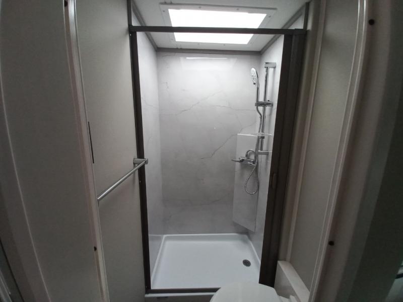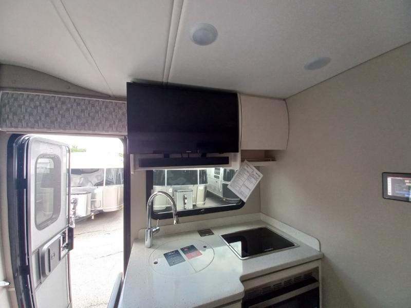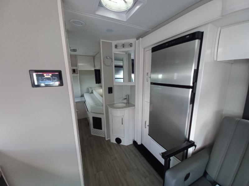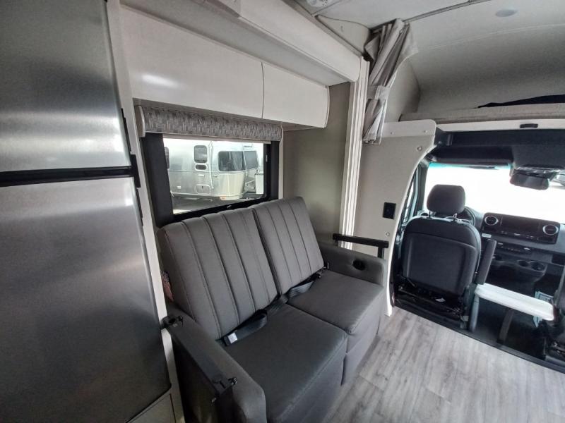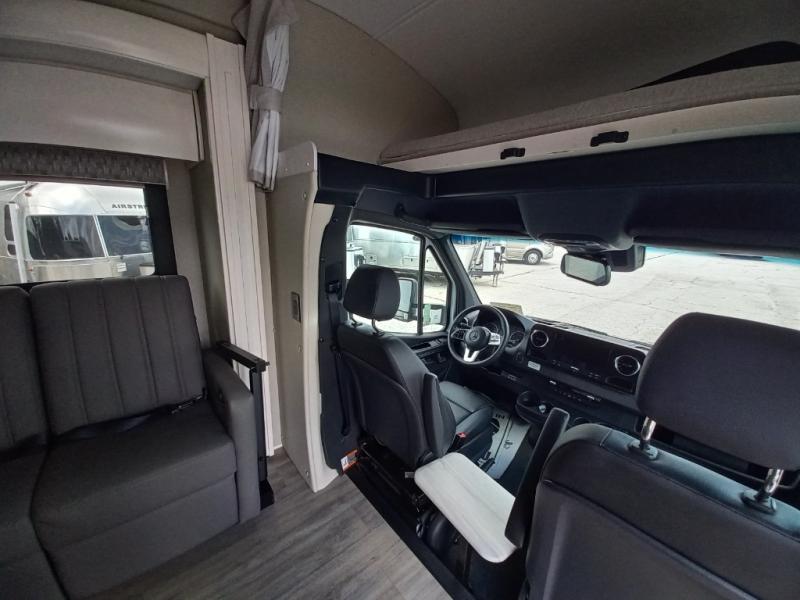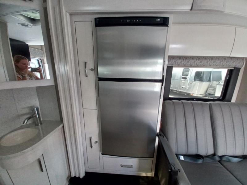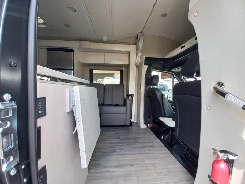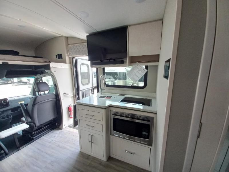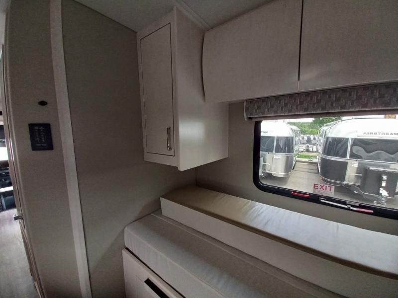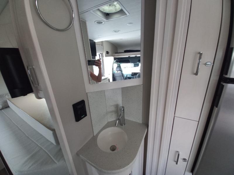 The perfect coach for two along with room for an added guest or little ones with the 46" x 80" over the cab bunk! You will appreciate the storage throughout for your belongings, so no worries about leaving anything behind. The single slide out along the driver's side adds more walking around space inside. Prepare light meals and snacks with ease while you travel with a two-burner cooktop and round sink for cleaning up. There is cupboard storage in the overhead areas for your dishes, and the refrigerator/pantry is located opposite within the sofa slide. The onboard bathroom features a private toilet and shower area with a separate sink just opposite the door. In the rear of the coach, there are two twin mattresses, a 24" TV and overhead storage along each side and rear of the coach, plus more storage can be found at the foot of each bed.