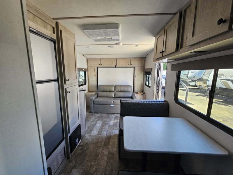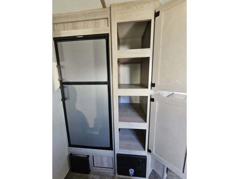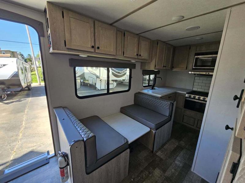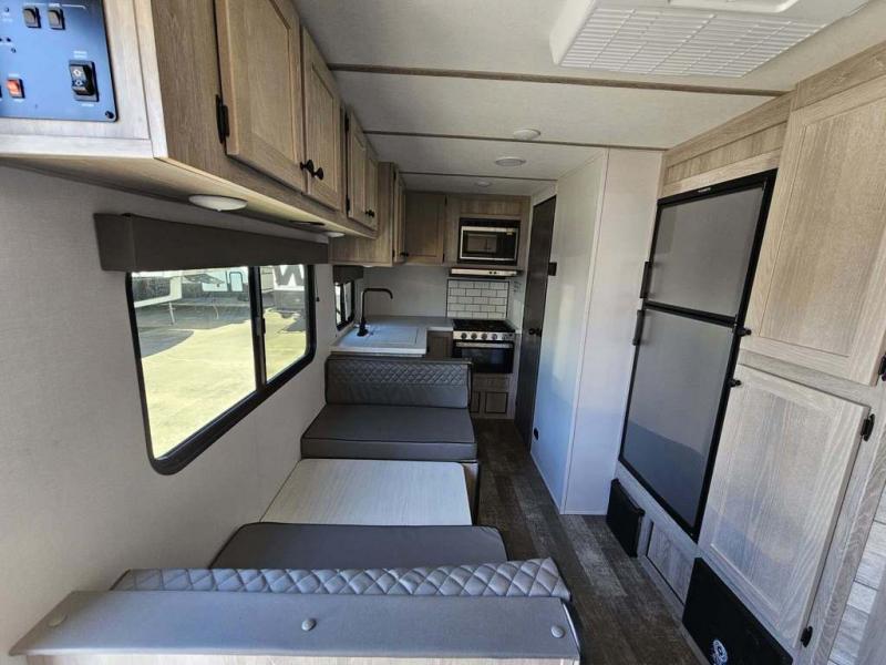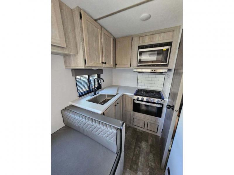 Ditch that old tent for this double-axle travel trailer for three. You will love being able to make your meals on a cooktop instead of a fire each night, and there is a full bath to clean up in after swimming in the lake. The booth dinette will be perfect for meal times, game night, and additional sleeping space, plus there is an RV queen bed in the front bedroom for you. If the weather isn't too hot you may just find yourselves outdoors more under the 11' awning with an LED light!
