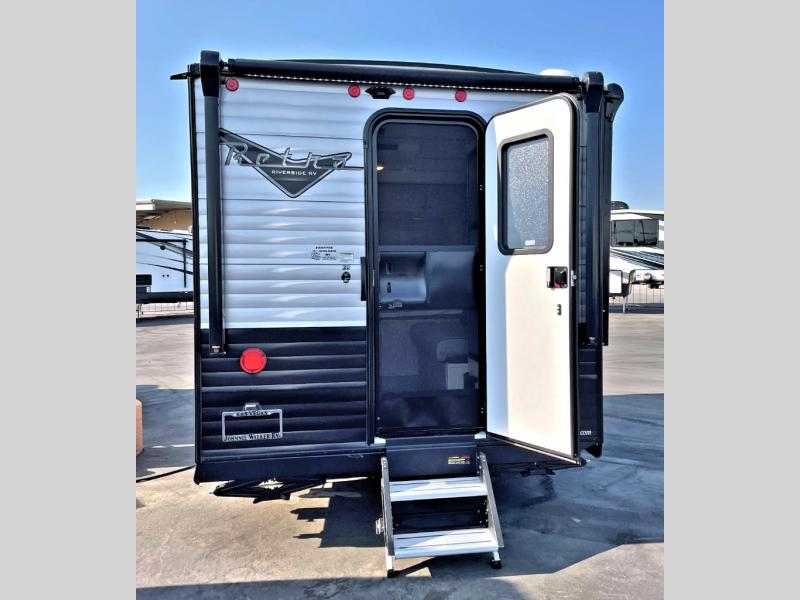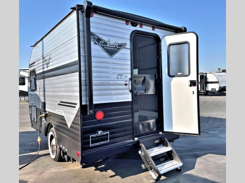 Each Retro travel trailer by Riverside RV will take you back in time with its vintage look, but will still impress you with its modern comforts. The Alpha Super Flex roof system and powder coated chassis provide durability, along with the diamond plate rock guard and reinforced galvanized steel wheel well. You'll enjoy indoor and outdoor speakers, USB ports for your electronics, plus an AM/FM/Bluetooth stereo to play your favorite tunes. New interior features include an Indratech high performance mattress, roller blinds, upgraded black faucets, and convenient sink covers that provide more counter space. Outside, you'll find a friction hinge entry door, a GE 15k rooftop A/C, and enlarged cargo doors with slam latch so you can easily load up your gear.