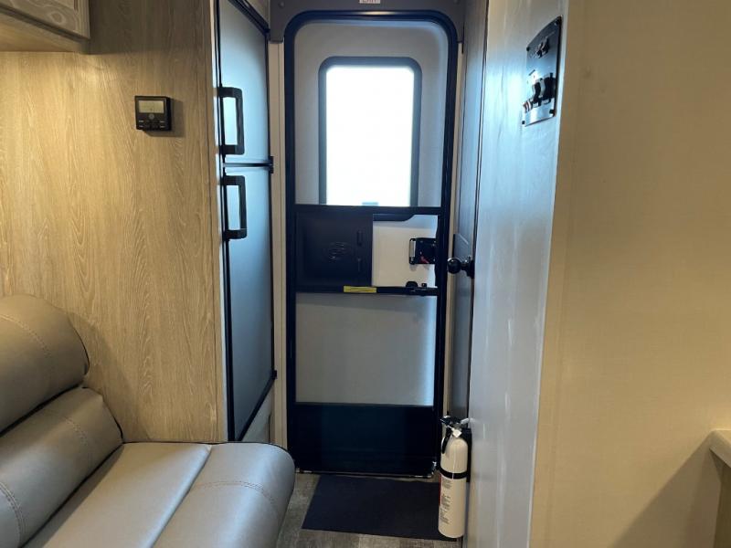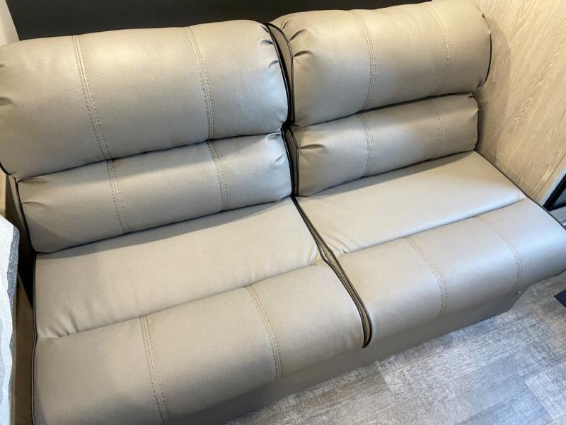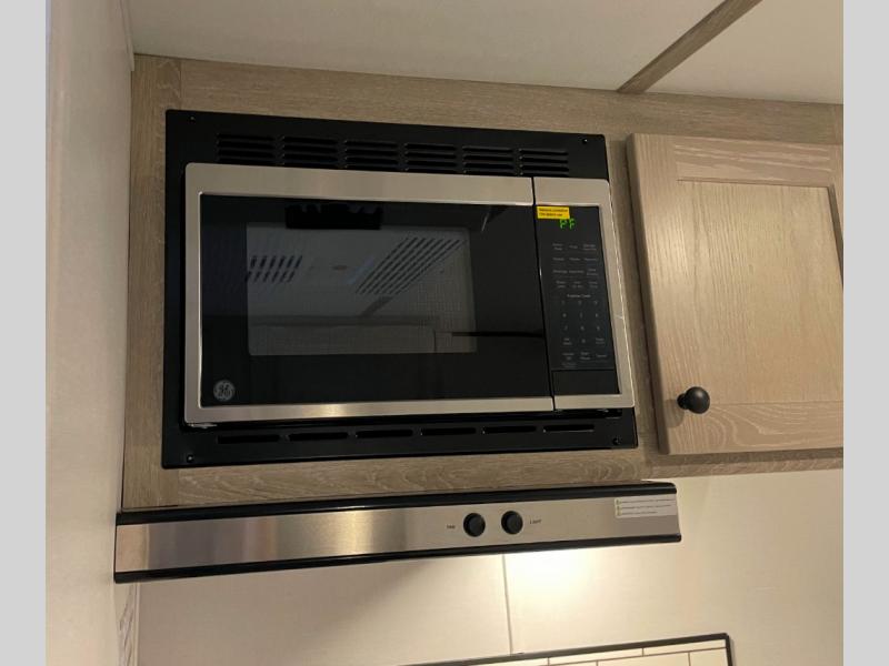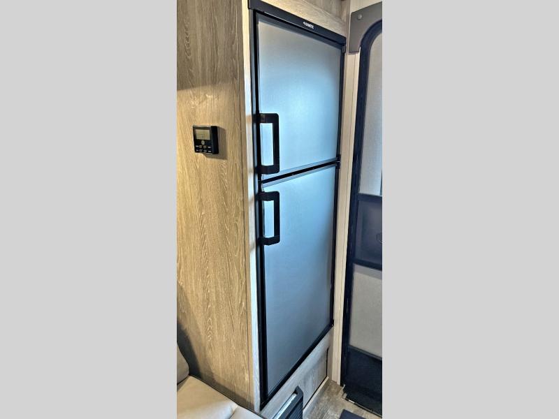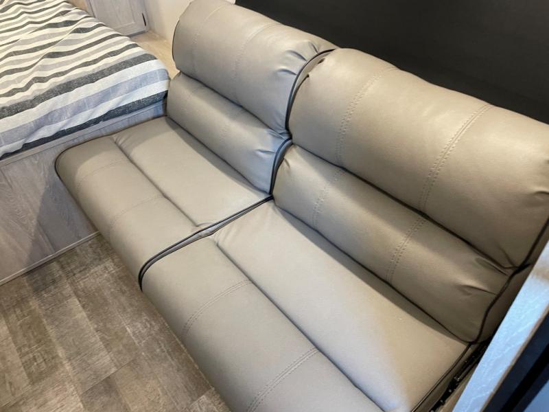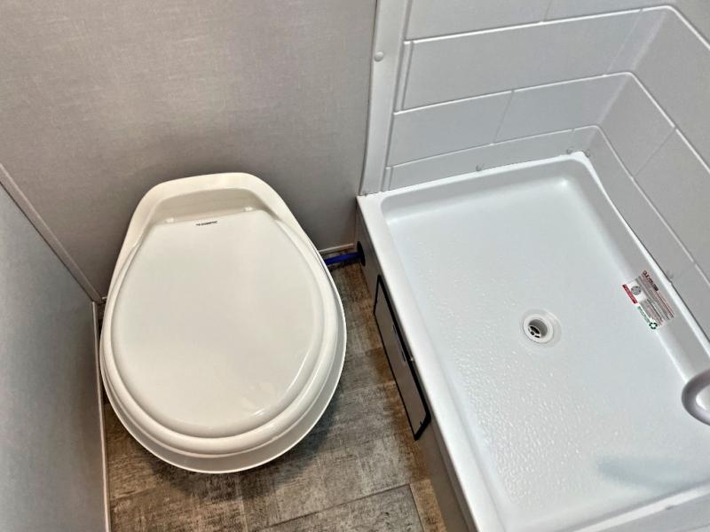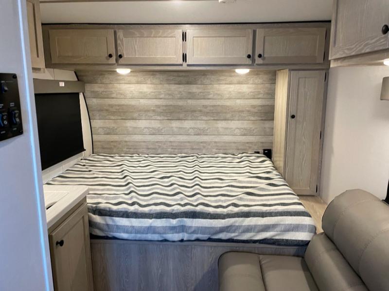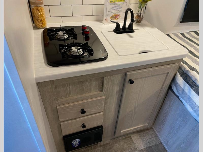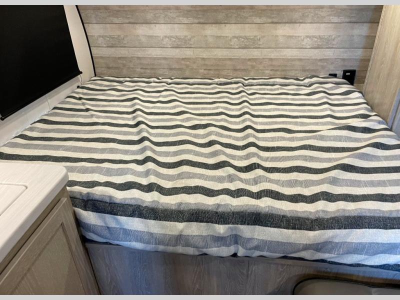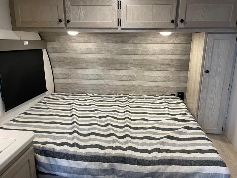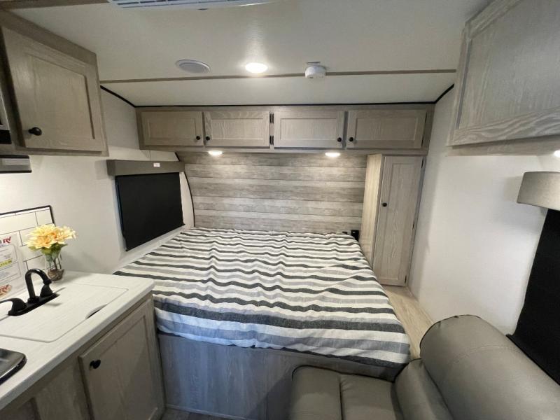 This travel trailer is cozy and to the point! You'll love not having to sleep on a tent floor or air mattress thanks to the front RV queen bed, and the overhead storage here is sure to come in handy. There is a kitchen base to prepare meals each day, and you can clean up in the convenient shower. This model also includes a sofa, or you can choose the optional booth dinette, and there is a refrigerator for your perishables! An optional rear awning can be added if you want to extend your outdoor living space!