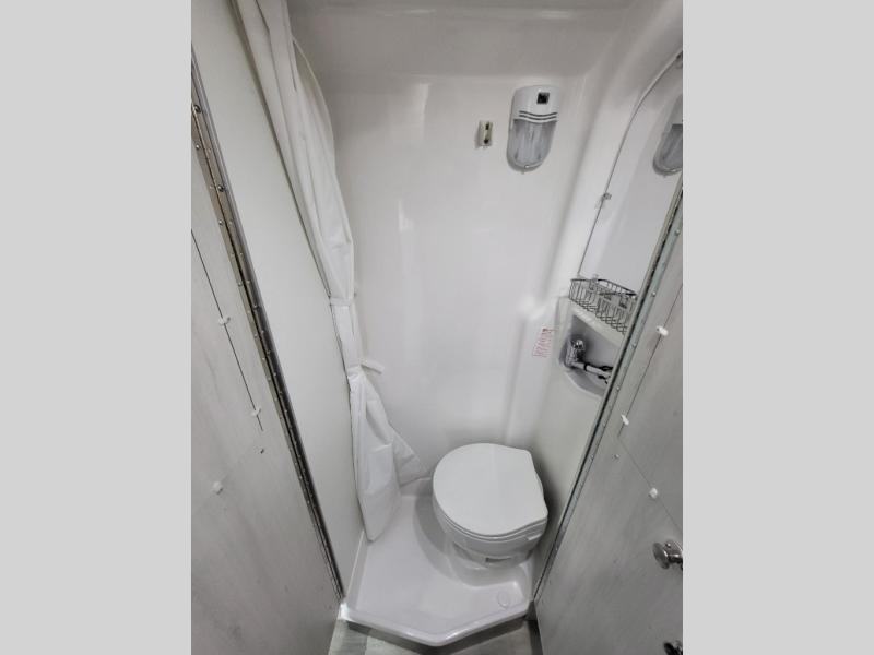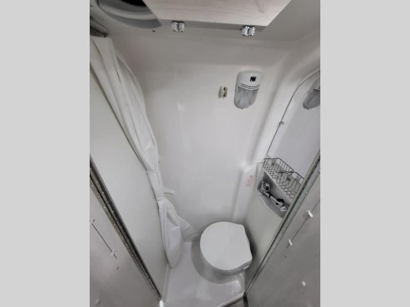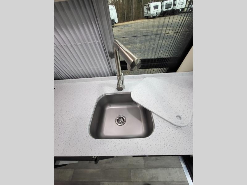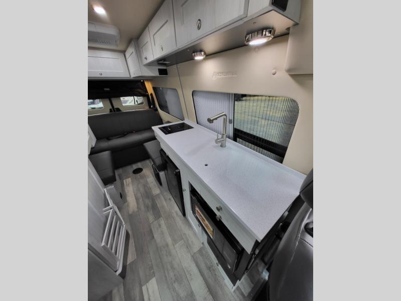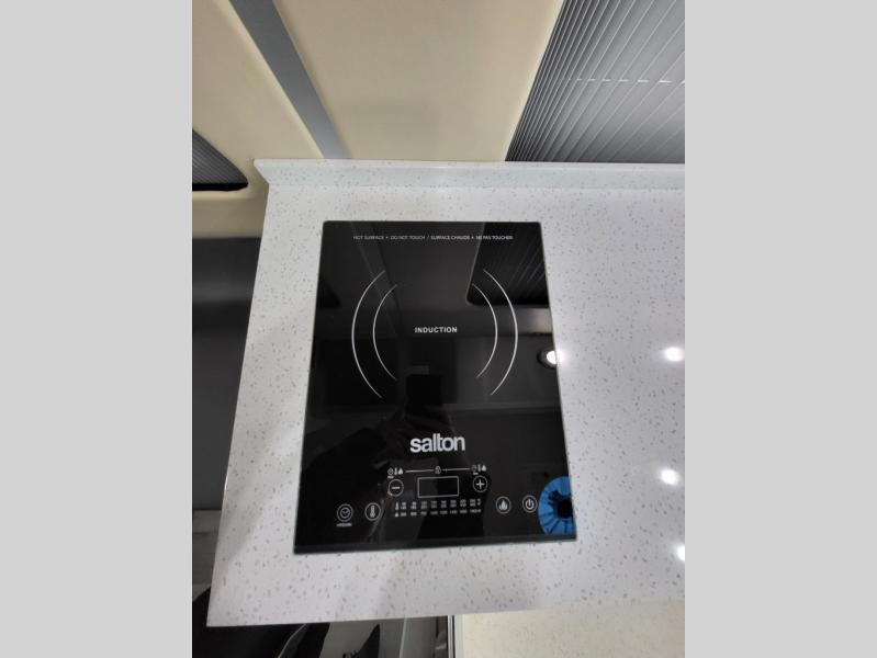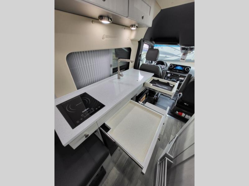 - Fully Equipped Galley: Includes a 3.1 cu ft 12V/110V refrigerator, two-burner cooktop (with optional induction stove), convection microwave, and solid surface countertops for convenient meal preparation.