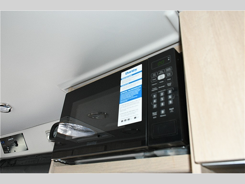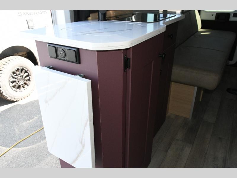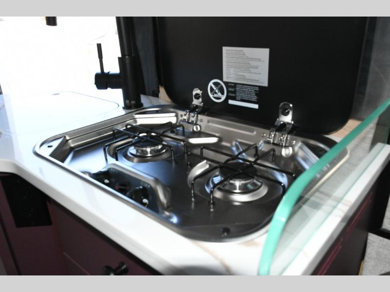 The interior features side-facing rear power sofas that convert to twin beds or a king-size bed, plus an optional folding mattress over the front captain’s seats for extra sleeping space. The kitchen is equipped with a two-burner propane stove, microwave, 12V refrigerator, large pot drawer, and slide-out pantry for convenient storage.