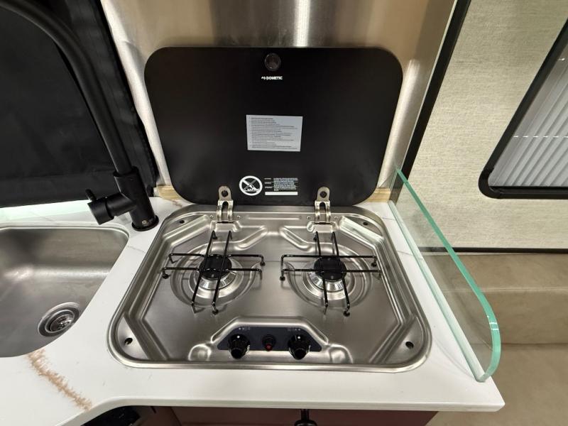 You can sleep four to five in this coach thanks to the pop-top sleeping area! You'll find plenty of storage space for items small and large, including a large pot drawer and a slide out pantry in the kitchen! The rear power sofa can easily convert to sleeping space at the push of a button, plus you can add the optional folding mattress to go over the front captain's seats if a grandkid tags along. Prepare breakfast on the two-burner propane stove or use the microwave oven if you're on-the-go. The wet bath with a sink, shower and toilet will allow you to freshen up after a day of hiking, and the 13' power awning outdoors will provide shade if you choose to dine outdoors for dinner.