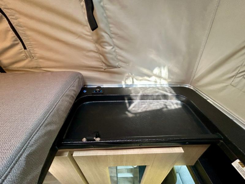 You can sleep four to five in this coach thanks to the pop-top sleeping area! You'll find plenty of storage space for items small and large, including a large pot drawer and a slide out pantry in the kitchen! The rear power sofa can easily convert to sleeping space at the push of a button, plus you can add the optional folding mattress to go over the front captain's seats if a grandkid tags along. Prepare breakfast on the two-burner propane stove or use the microwave oven if you're on-the-go. The wet bath with a sink, shower and toilet will allow you to freshen up after a day of hiking, and the 13' power awning outdoors will provide shade if you choose to dine outdoors for dinner.