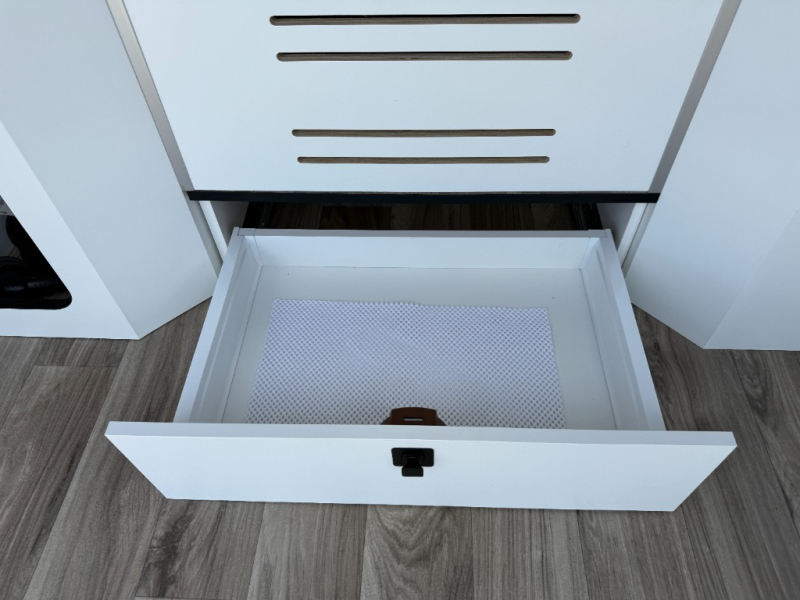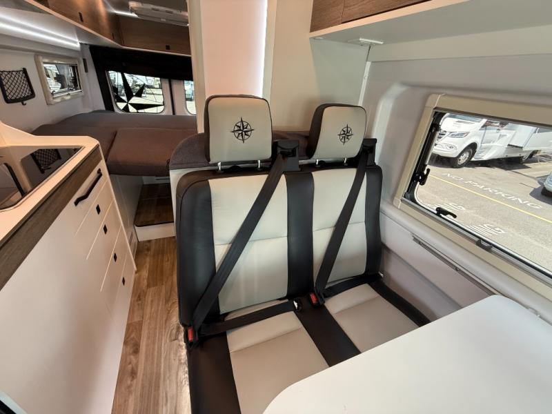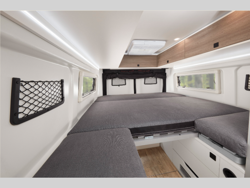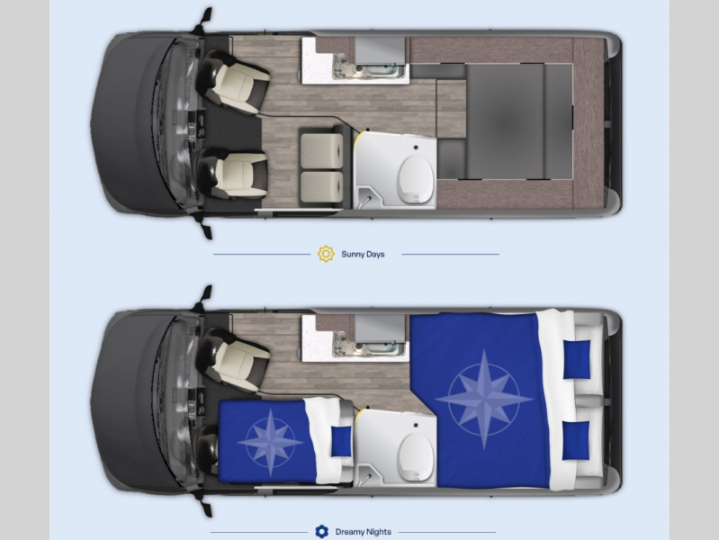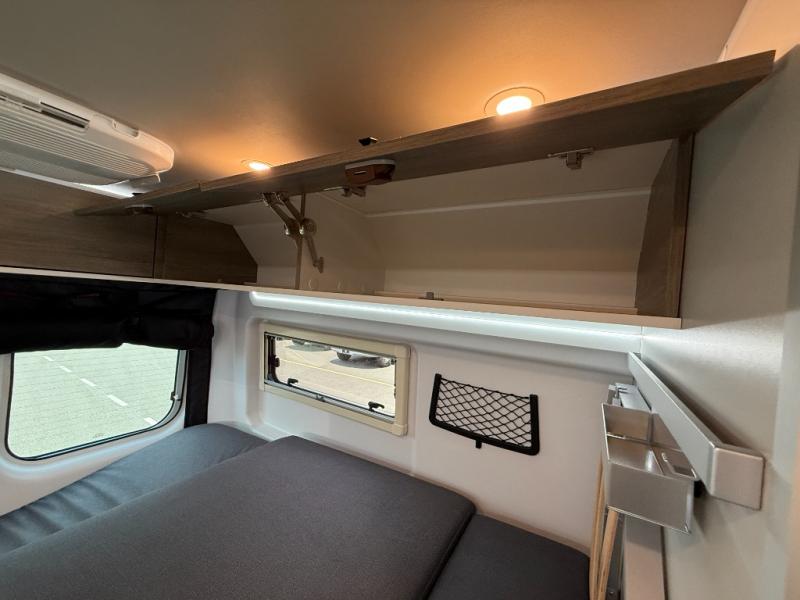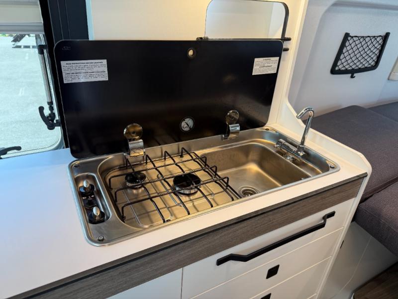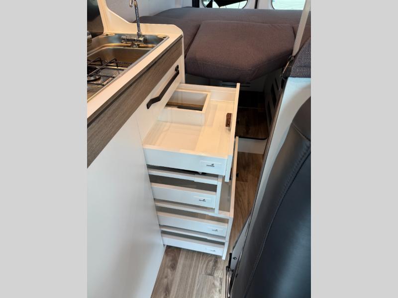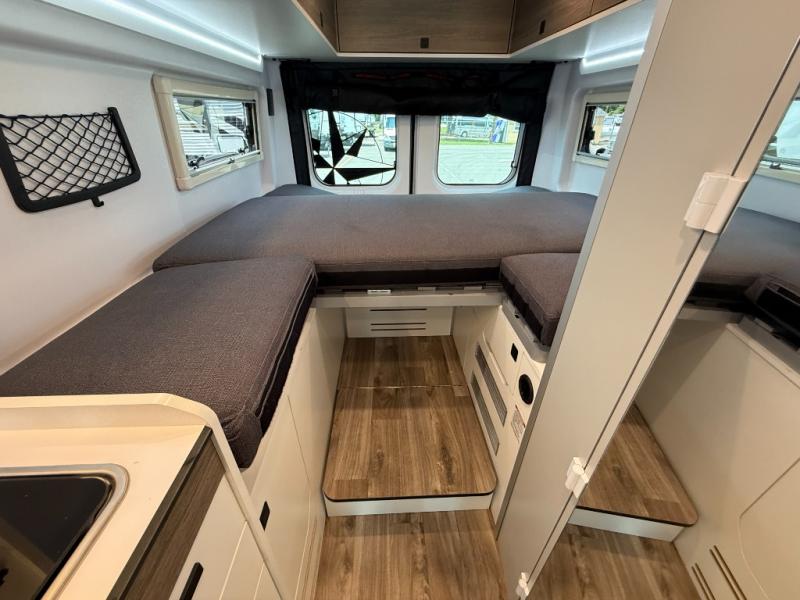 The Roadtrek Westfalia Wave Pop Top is a perfect choice - small size but packed with features and ready for fun! The interior features a well-equipped kitchen with microwave, 2-burner cooktop, and 3.2 cubic foot refrigerator. There's plenty of storage with 17 different cabinets and drawers, featuring clever solutions for all your belongings. At night there's the rear convertible bed, which can be equipped with a king or queen mattress, the bench/bed in the dining area, and the pop top roof with its own mattress. Screen window with roll shades mean you can enjoy the breeze without the bugs.