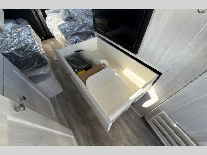 Whether you need more space for your bicycles, gear, or luggage, you will love the open-concept layout of the Zion coach. Each morning you can prepare breakfast on the two-burner propane stove, or use the convenient microwave oven. Head out to find a trail or two, and the wet bath will be waiting for you when you return. The countertop extension with a charging station will provide a place to download your pictures from your hike, and there is a slide-out pantry to grab a snack to hold you over until dinner. The side-facing rear power sofas easily convert to twin beds or a king-size bed for your comfort.
