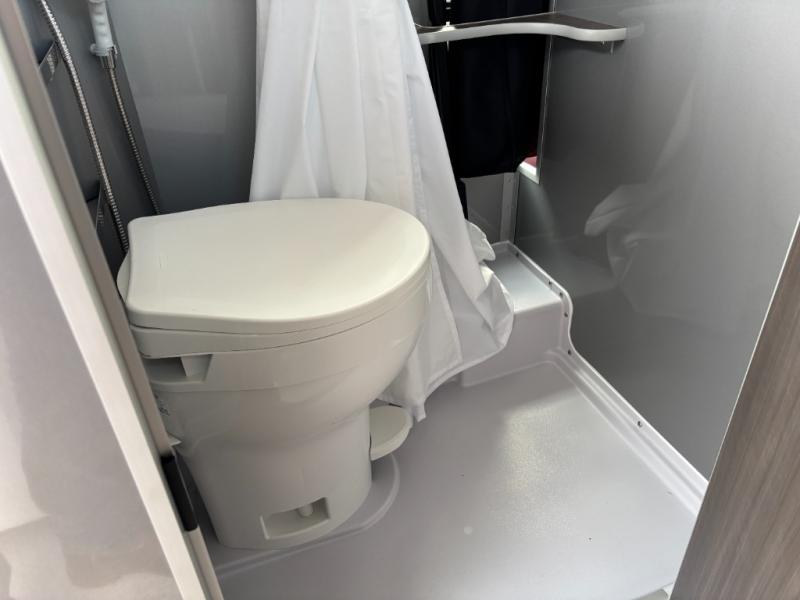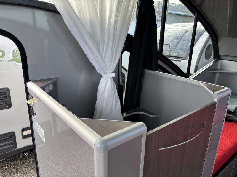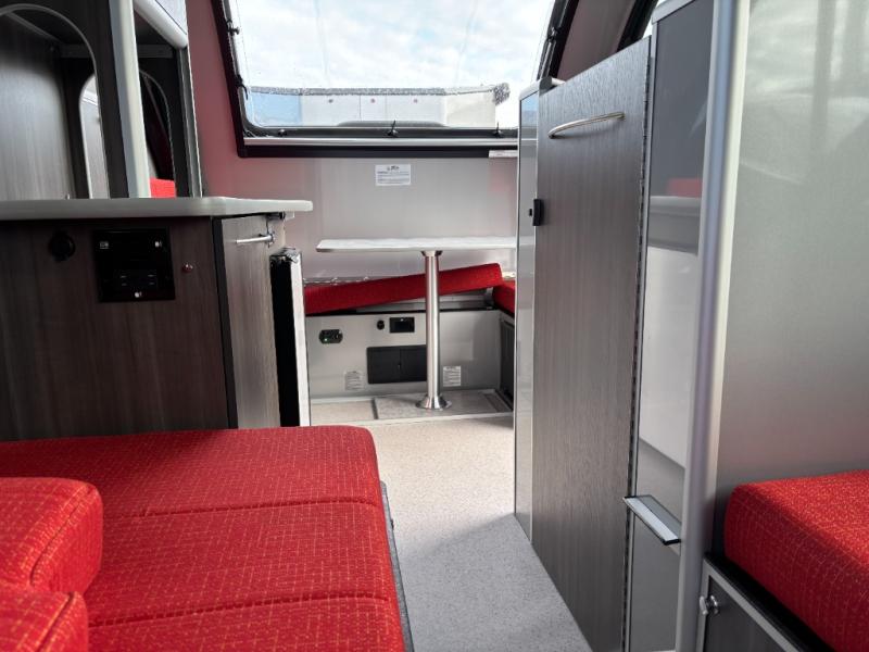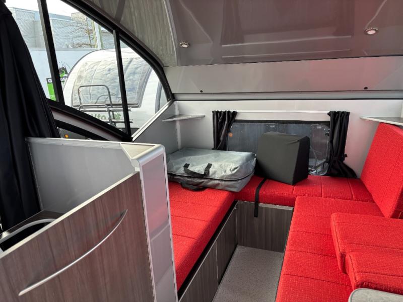 Wherever you decide to camp, you'll enjoy at-home comforts in this compact travel trailer. There is a large 60" x 76" bed-size to sleep on each night, and the dining area converts to a 36" x 81' single bed for guests. A shower with a curtain and a flush toilet will let you freshen up each day, an the front dining area can be used when when the rear bed is deployed. You also have the ability to set up two separate dining areas by moving the table if you choose. A two burner LPG stove will let you cook meals each day, and perishables can go in the 3.1 cu. ft. refrigerator.