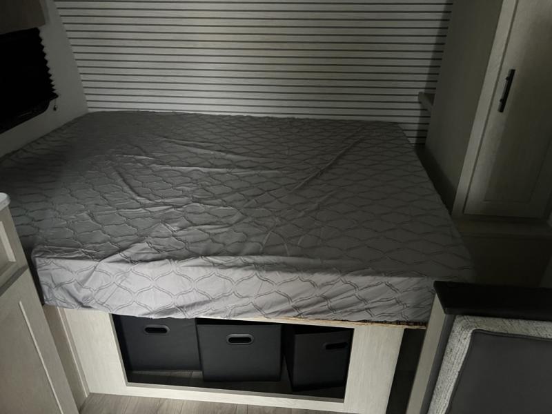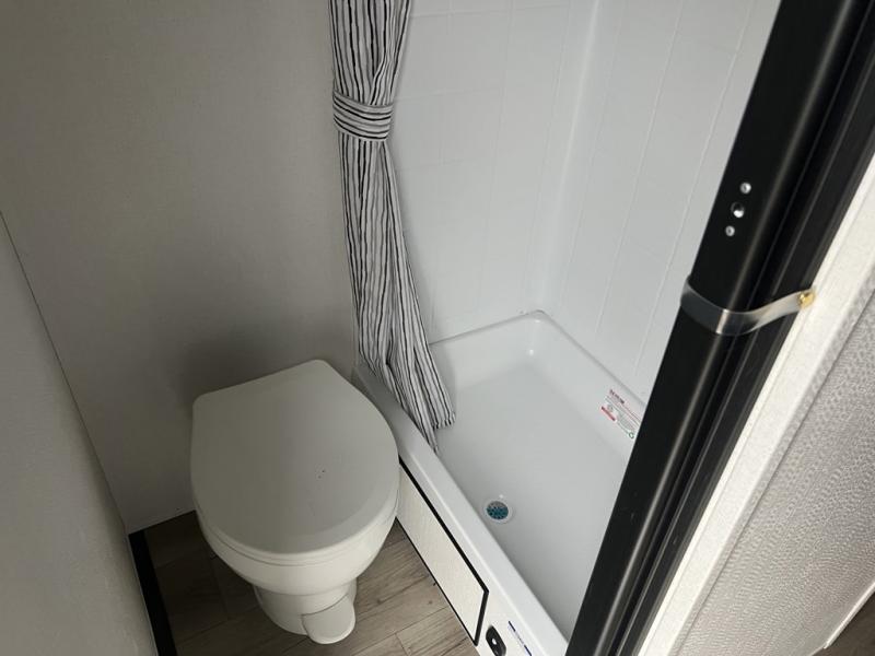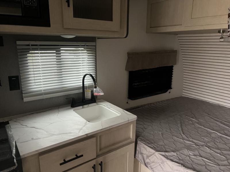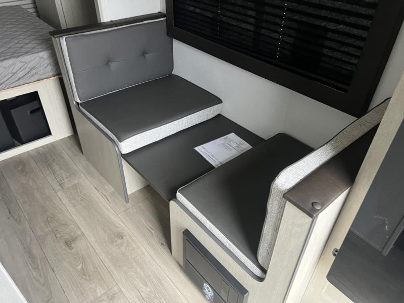 You will love exploring different campgrounds in this rear entry travel trailer! Since there is a front queen bed, a booth dinette, plus a flip-up bunk above the dinette, you can sleep four people comfortably. The private bathroom includes a toilet and a shower to freshen up in each day, and you can use the kitchen sink to brush your teeth at night. This model also includes an exterior pass-through storage for larger camp gear and an outside shower to wash your hiking gear off!