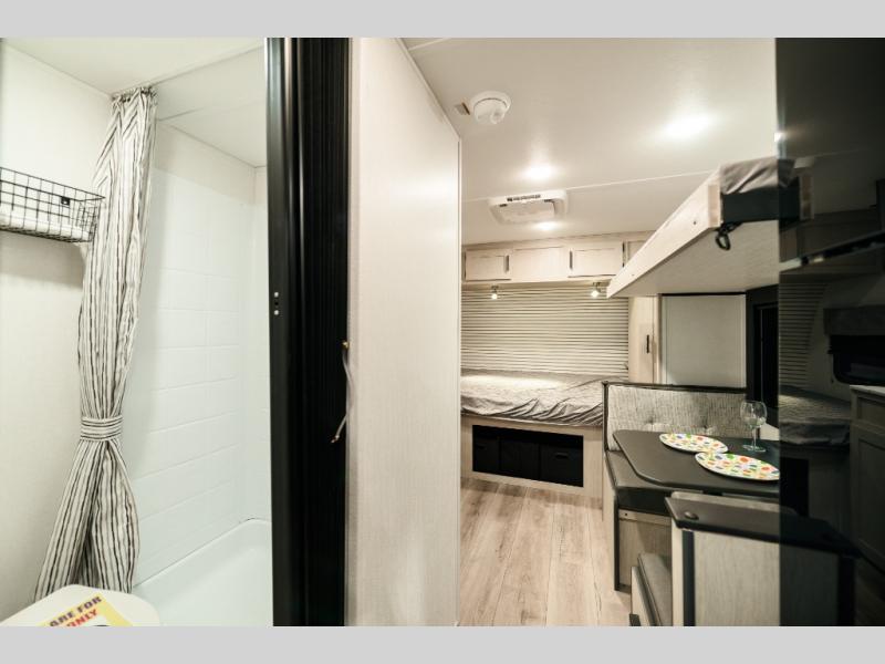 You will love exploring different campgrounds in this rear entry travel trailer! Since there is a front queen bed, a booth dinette, plus a flip-up bunk above the dinette, you can sleep four people comfortably. The private bathroom includes a toilet and a shower to freshen up in each day, and you can use the kitchen sink to brush your teeth at night. This model also includes an exterior pass-through storage for larger camp gear and an outside shower to wash your hiking gear off!