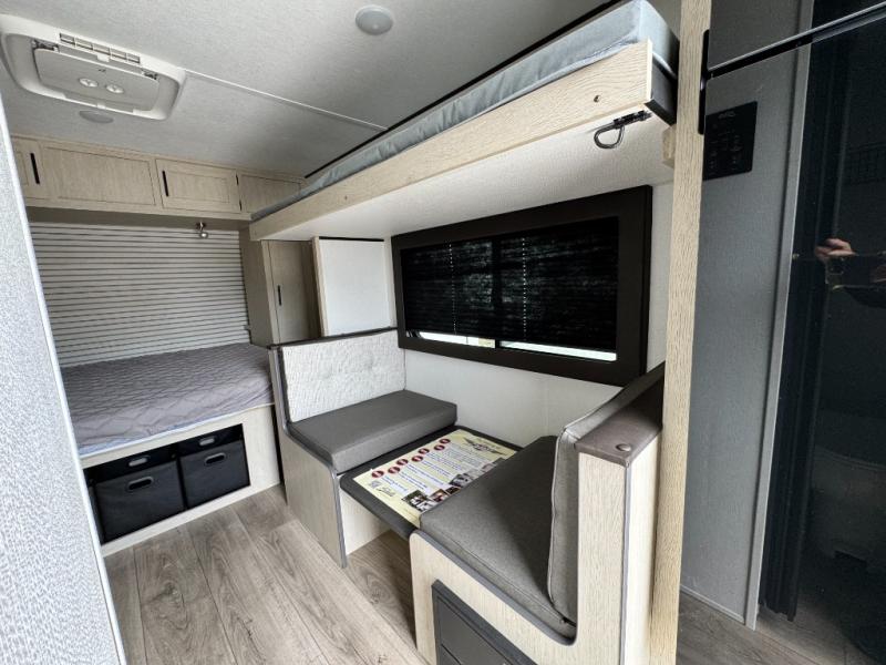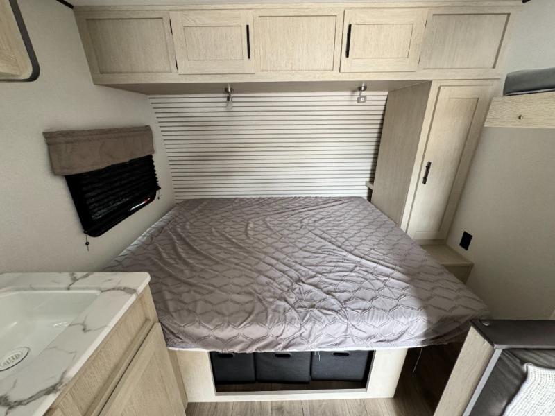 You will love exploring different campgrounds in this rear entry travel trailer! Since there is a front queen bed, a booth dinette, plus a flip-up bunk above the dinette, you can sleep four people comfortably. The private bathroom includes a toilet and a shower to freshen up in each day, and you can use the kitchen sink to brush your teeth at night. This model also includes an exterior pass-through storage for larger camp gear and an outside shower to wash your hiking gear off!