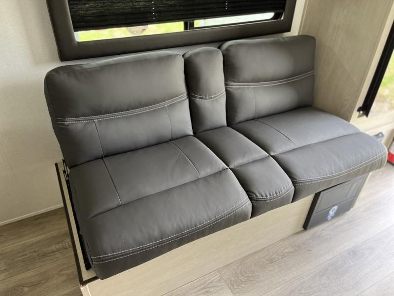 Inside, you’ll find a smart layout that maximizes space without feeling cramped. The front queen bed includes overhead storage, a wardrobe, and a convenient bed shelf to keep essentials close. A sofa provides additional seating and sleeping space, perfect for guests or relaxing after a day outdoors.