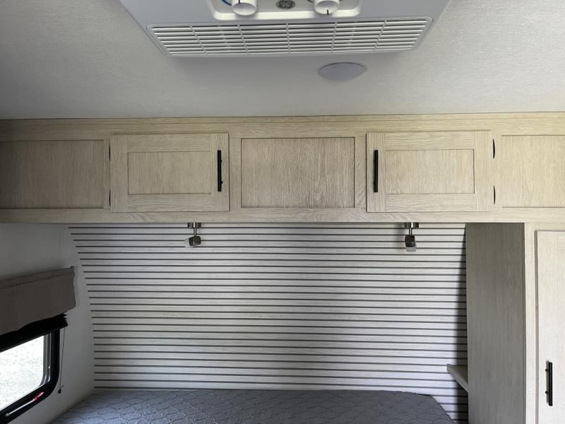The private rear bathroom includes a toilet and shower, so you can skip late-night walks to the campground facilities. The kitchen is equipped with a two-burner cooktop, microwave oven, and 4.5 cu. ft. refrigerator, making it easy to prep meals on the road.