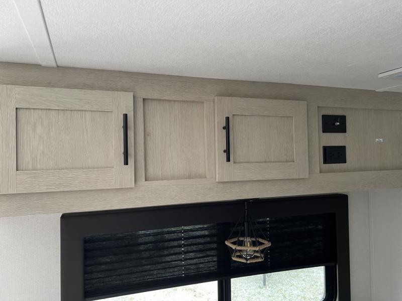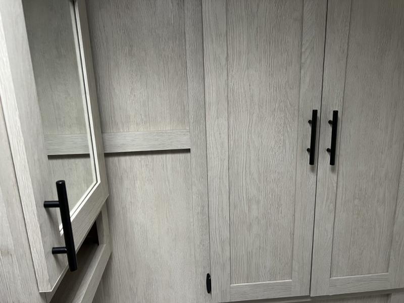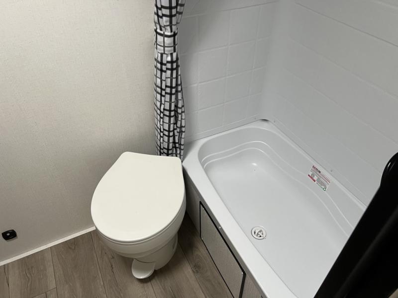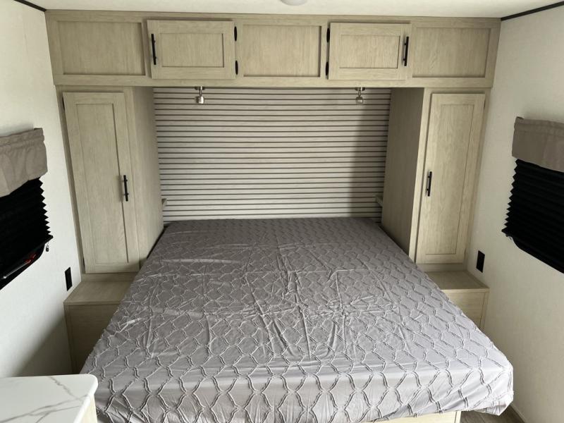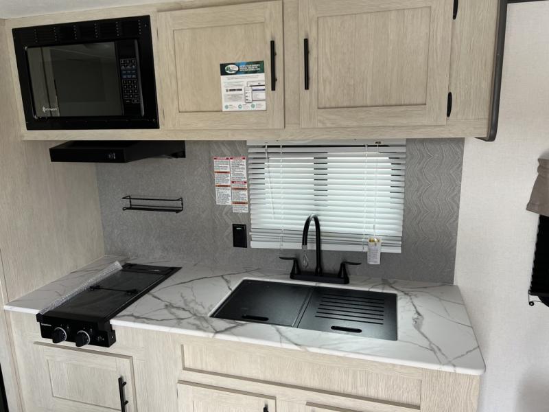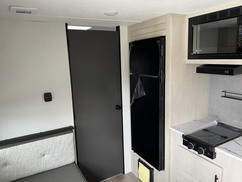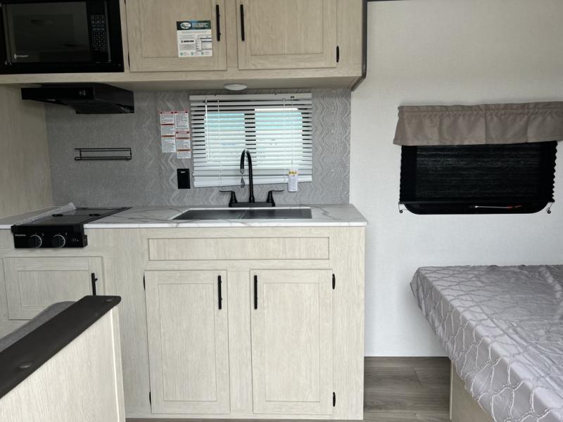This travel trailer will feel just like home since there is a front bedroom with an RV queen bed, dual wardrobes to keep your clothes tidy, plus a spacious full rear bath. There is a 24" x 40 shower pan here, plus a medicine cabinet and a spacious bath linen closet to keep clean towels close by. Head to the kitchen to prepare lunch on the two burner cooktop or use the microwave cabinet to heat up leftovers. There is a booth dinette where you can dine together and even let an overnight guests or two littles ones sleep on!