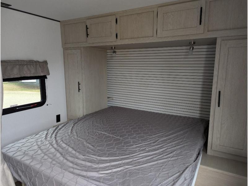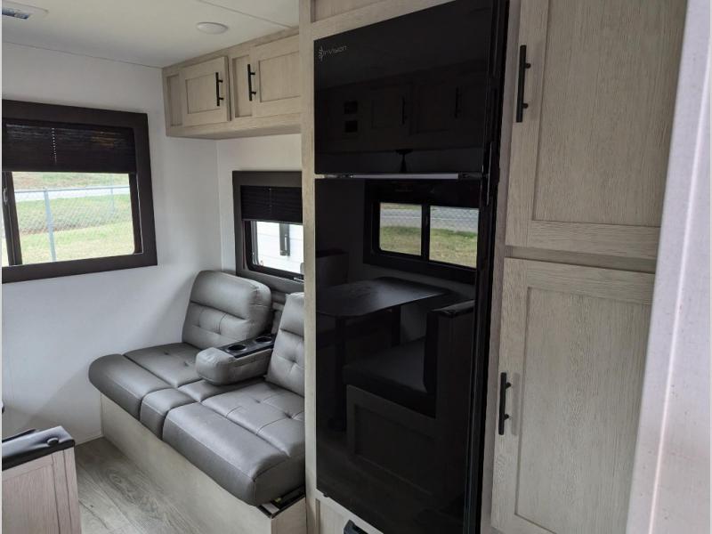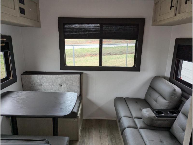 This non-slide i-5 Edition features everything you need for a cozy weekend away a a couples unit or small family of three or four. The rear of the unit features ample seating with opposing sofa and booth dinette. Each can accommodate a tired camper at night if needed. The kitchen is fully equipped for your camping trips featuring a three burner cooktop, a microwave cabinet, a large sink, plus a pantry and residential style refrigerator for food storage. In the front of this unit, a 60" x 74" RV queen bed provides a comfortable night's rest after a full day of fun. Outside, enjoy a nice pass-through storage compartment to easily access all of your outdoor camping gear plus more.