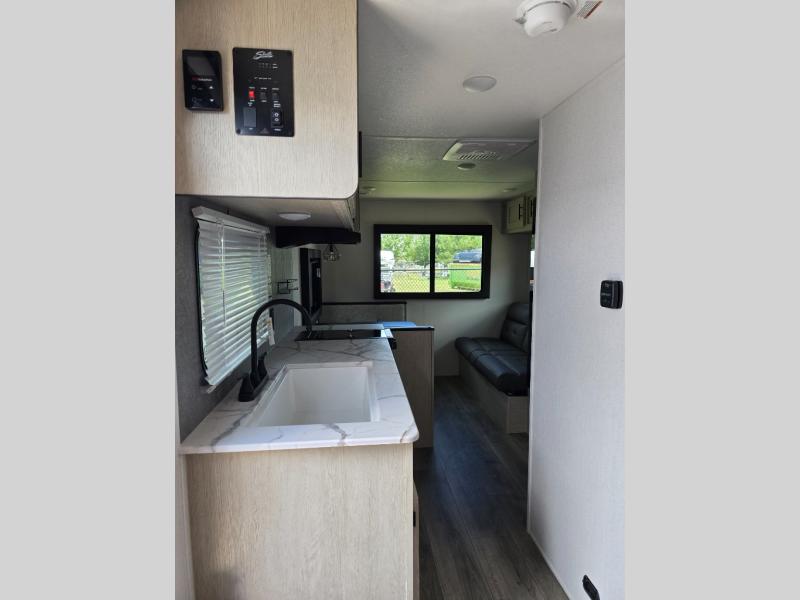 In any Shasta i-5 Edition travel trailer, you will find quality craftsmanship along with an affordable price tag. These units each feature four stabilizer jacks to make setting up easier and an enclosed underbelly for added protection as you travel. The Base Camp Package provides each unit with black tank flush, a monitor panel for quick access to the functions of your unit, a 13.5K A/C unit, and a tankless water heater for added convenience. Inside, you'll find seamless countertops, sink covers, a portable Bluetooth speaker, and more comforts!
