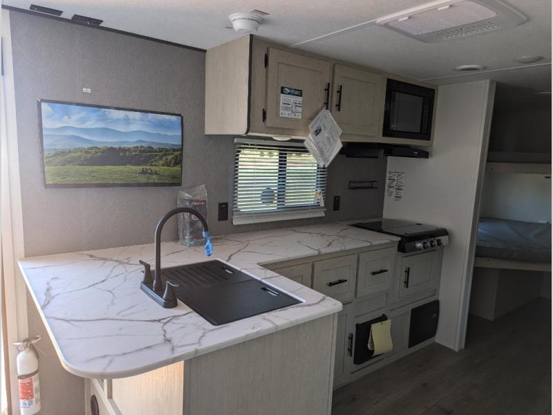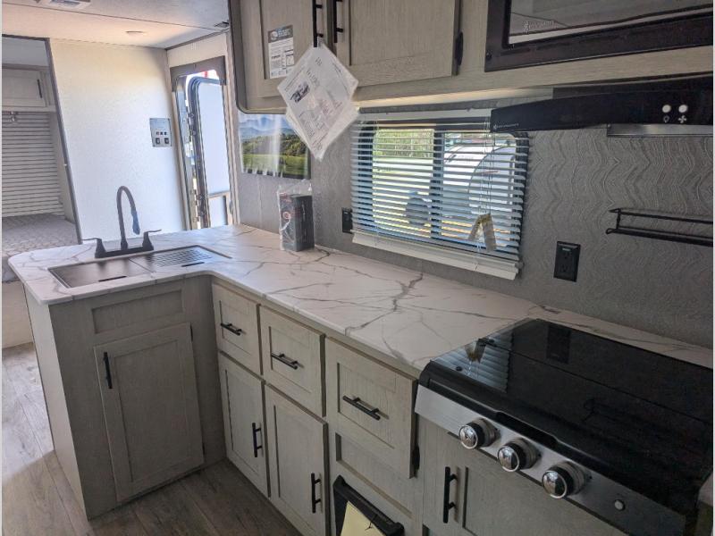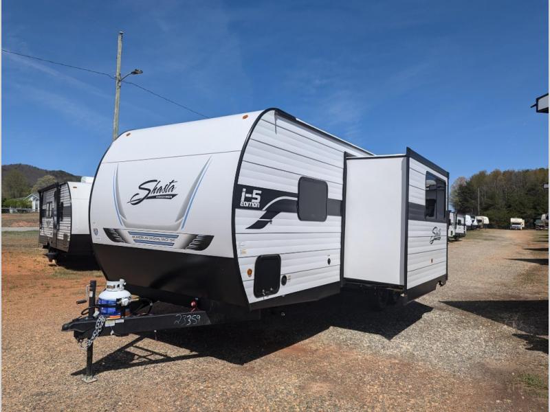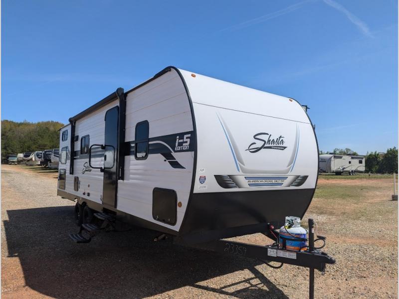 In any Shasta i-5 Edition travel trailer, you will find quality craftsmanship along with an affordable price tag. These units each feature four stabilizer jacks to make setting up easier and an enclosed underbelly for added protection as you travel. The Base Camp Package provides each unit with black tank flush, a monitor panel for quick access to the functions of your unit, a 13.5K A/C unit, and a tankless water heater for added convenience. Inside, you'll find seamless countertops, sink covers, a portable Bluetooth speaker, and more comforts!