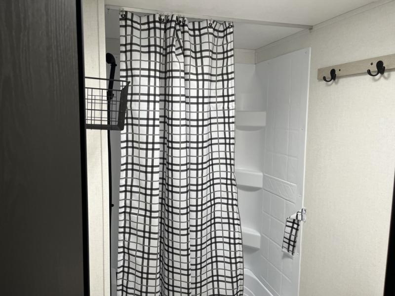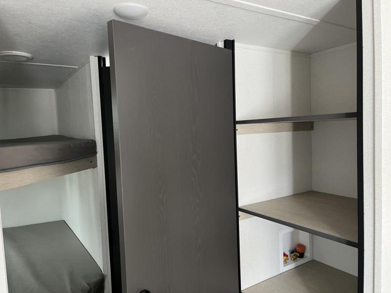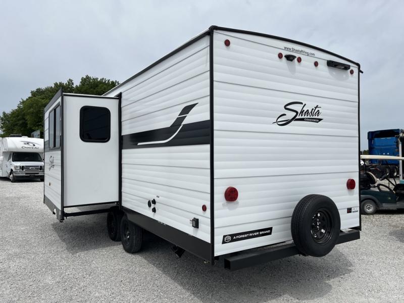 Enjoy camping with family and friends in this Shasta i-5 Edition bunk model! There are double-size bunks in the rear roadside corner and a full bath with a shower, vanity, and toilet in the opposite rear corner. There is ample counter space in the kitchen, plus there is an outside kitchen when you want to cook outdoors. You will also love the pantry in this unit that is washer/dryer ready if you want to add those appliances. A booth dinette within the large slide will provide a place to dine and play games together, and there is a TV mount across the room if you want to add entertainment. You'll love having a front bedroom with a 60" x 74" bed and dual wardrobes to keep your things picked up!