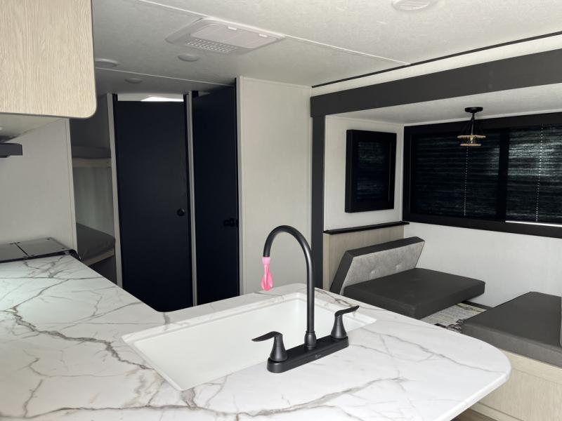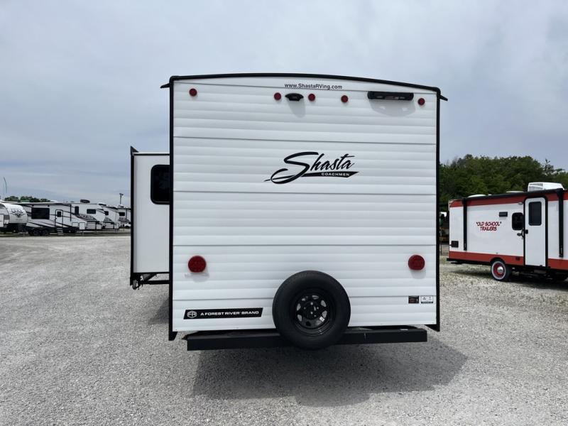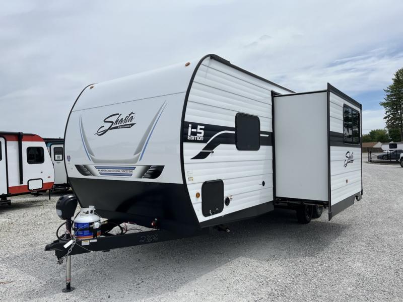 In any Shasta i-5 Edition travel trailer, you will find quality craftsmanship along with an affordable price tag. These units each feature four stabilizer jacks to make setting up easier and an enclosed underbelly for added protection as you travel. The Base Camp Package provides each unit with black tank flush, a monitor panel for quick access to the functions of your unit, a 13.5K A/C unit, and a tankless water heater for added convenience. Inside, you'll find seamless countertops, sink covers, a portable Bluetooth speaker, and more comforts!