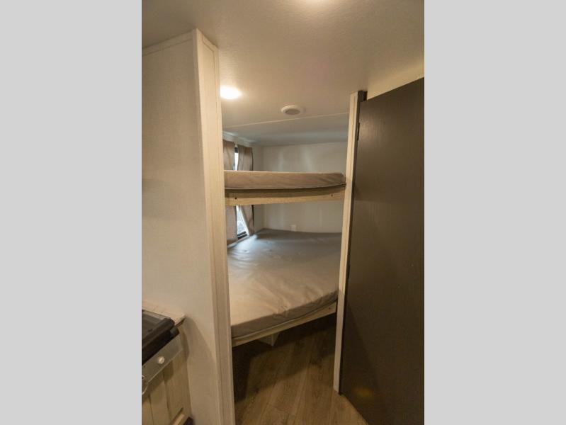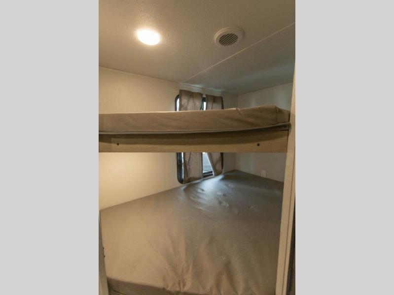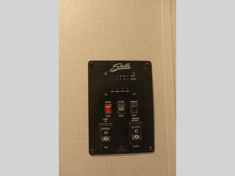 Enjoy camping with family and friends in this Shasta i-5 Edition bunk model! There are double-size bunks in the rear roadside corner and a full bath with a shower, vanity, and toilet in the opposite rear corner. There is ample counter space in the kitchen, plus there is an outside kitchen when you want to cook outdoors. You will also love the pantry in this unit that is washer/dryer ready if you want to add those appliances. A booth dinette within the large slide will provide a place to dine and play games together, and there is a TV mount across the room if you want to add entertainment. You'll love having a front bedroom with a 60" x 74" bed and dual wardrobes to keep your things picked up!