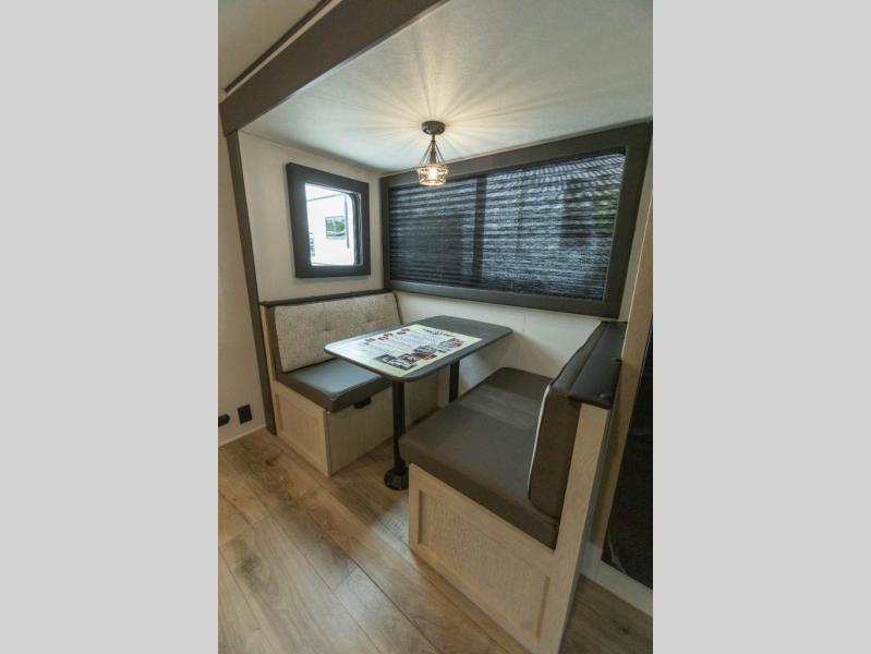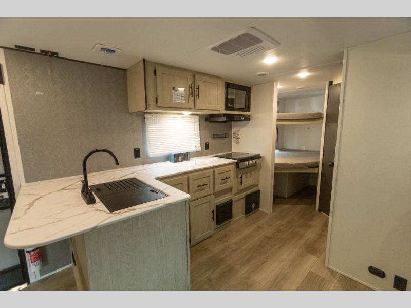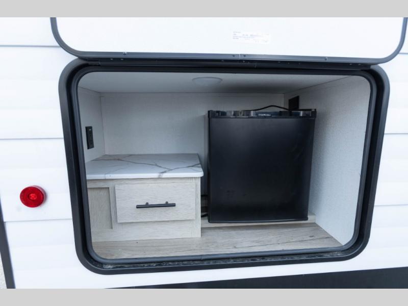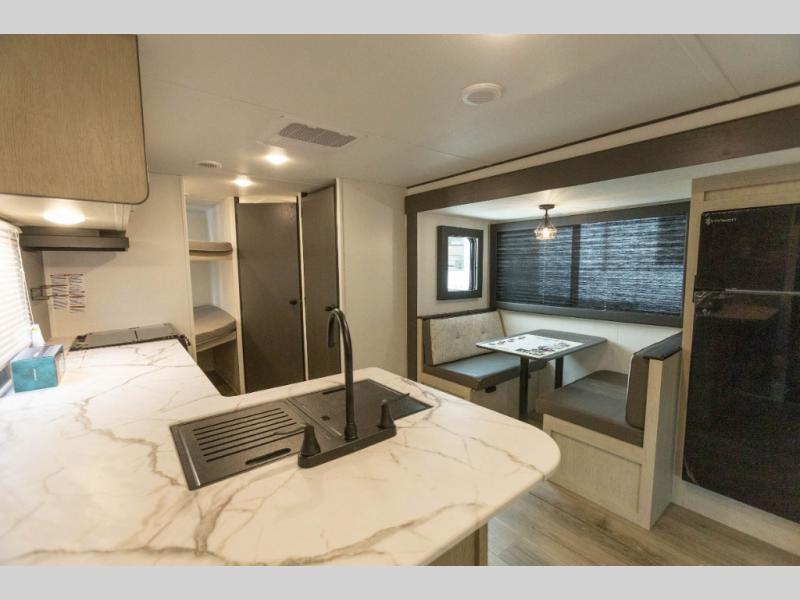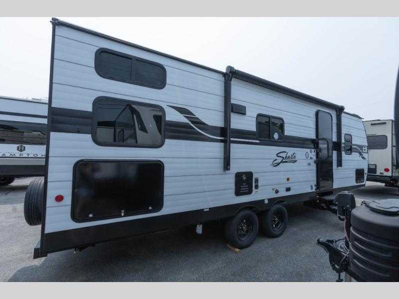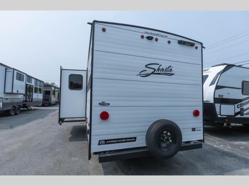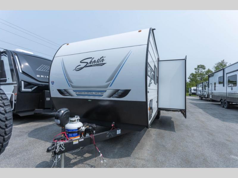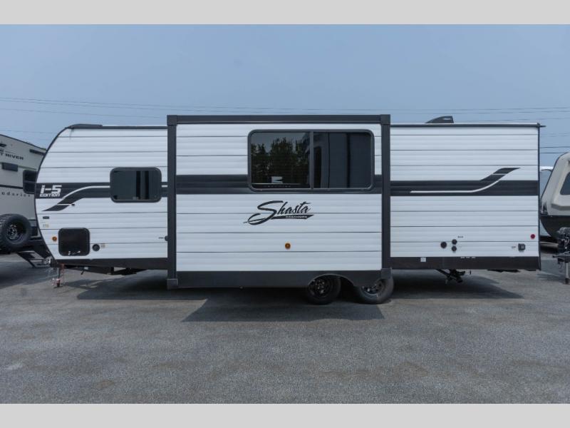 In any Shasta i-5 Edition travel trailer, you will find quality craftsmanship along with an affordable price tag. These units each feature four stabilizer jacks to make setting up easier and an enclosed underbelly for added protection as you travel. The Base Camp Package provides each unit with black tank flush, a monitor panel for quick access to the functions of your unit, a 13.5K A/C unit, and a tankless water heater for added convenience. Inside, you'll find seamless countertops, sink covers, a portable Bluetooth speaker, and more comforts!