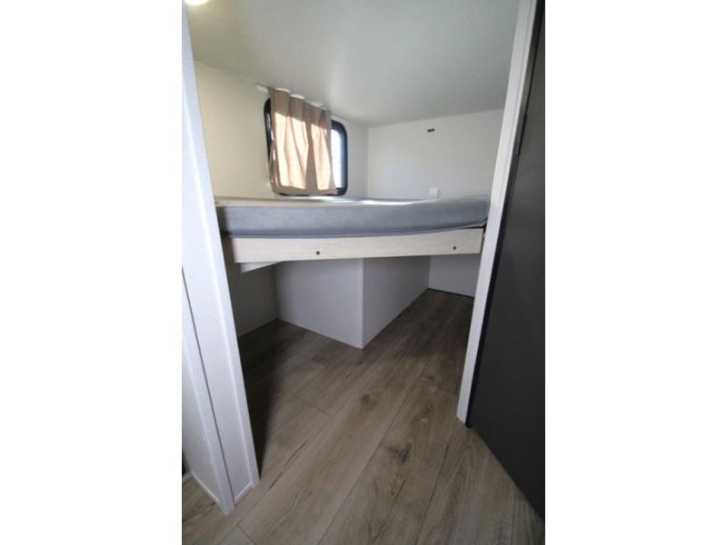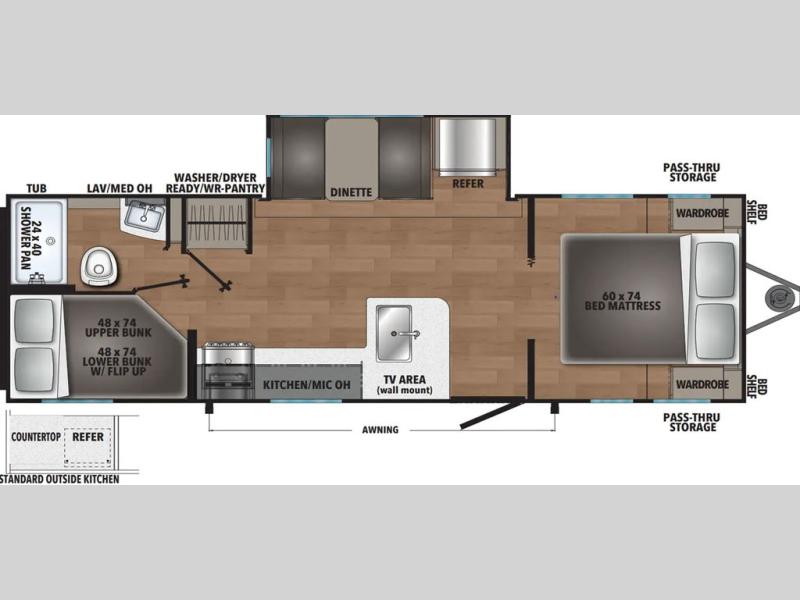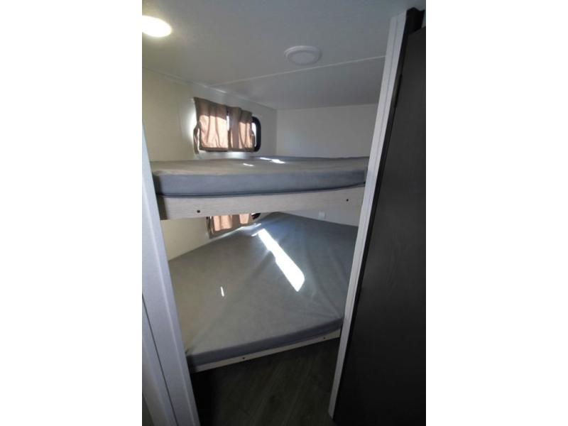 Enjoy camping with family and friends in this Shasta i-5 Edition bunk model! There are double-size bunks in the rear roadside corner and a full bath with a shower, vanity, and toilet in the opposite rear corner. There is ample counter space in the kitchen, plus there is an outside kitchen when you want to cook outdoors. You will also love the pantry in this unit that is washer/dryer ready if you want to add those appliances. A booth dinette within the large slide will provide a place to dine and play games together, and there is a TV mount across the room if you want to add entertainment. You'll love having a front bedroom with a 60" x 74" bed and dual wardrobes to keep your things picked up!
