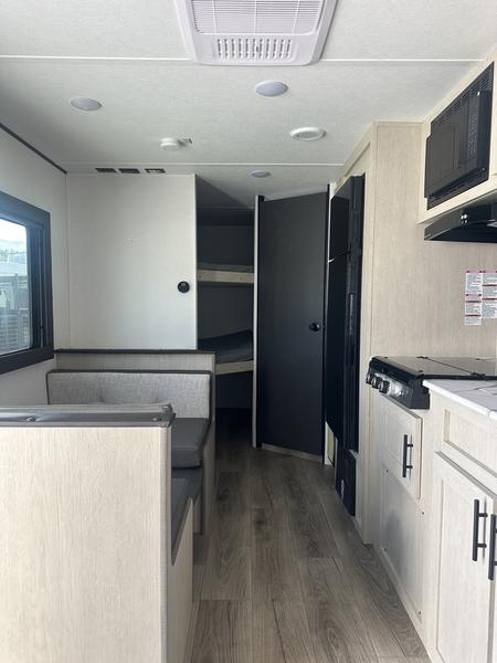 Enjoy camping with family and friends in this Shasta i-5 Edition bunk model! There are double-size bunks in the rear roadside corner and a full bath with shower, vanity, and toilet in the opposite rear corner. The kitchen is fully equipped for your camping trips featuring a three burner cooktop, a microwave cabinet, a large sink, and an 8 cu. ft. residential-style refrigerator. You will also love the pantry for all of your canned goods and snacks. In the front of this unit, a semi-private bedroom with a curtain provides a quiet retreat from the rest of the unit, and there are dual wardrobes to keep your clothes tidy.