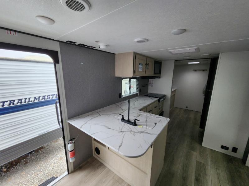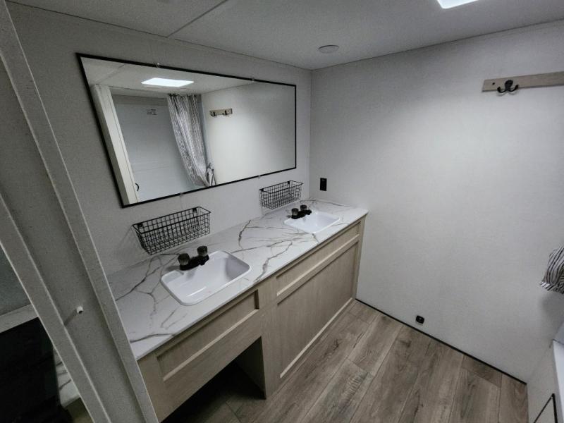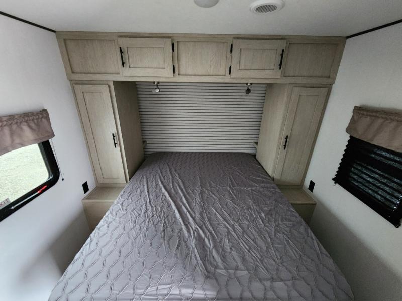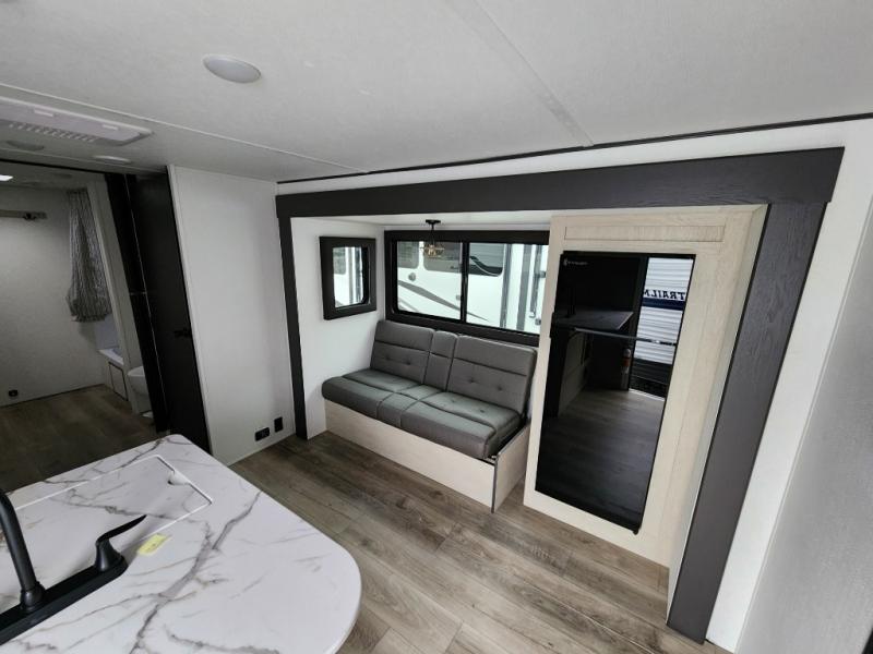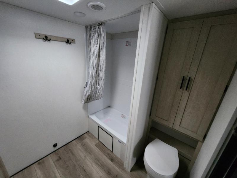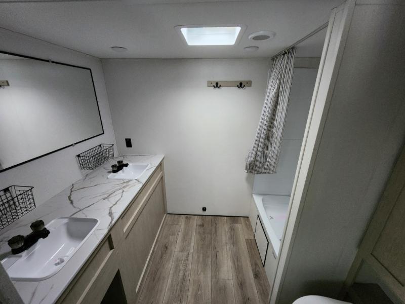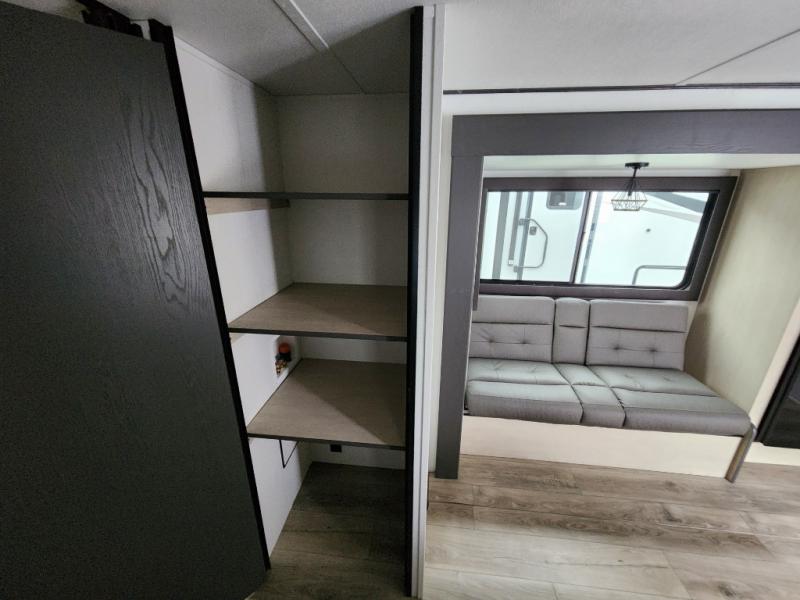 You'll feel right at home in this spacious travel trailer thanks to the large slide out, front bedroom, and full rear bath. There is a 24" x 40" tub, a toilet with partitions, and dual bath sinks with a mirror which allow you both to get ready for bed at once. The fully-equipped interior kitchen includes generous counter space to prep meals, and the outside kitchen will be perfect when the weather is nice. A large pantry will give you a place to store food, paper products, and more, plus this space is washer/dryer ready if you choose to add those appliances.