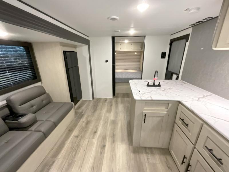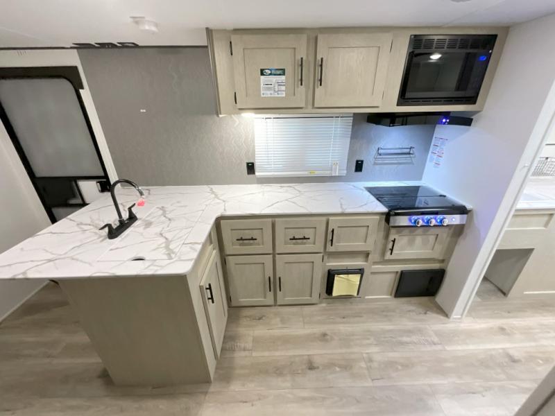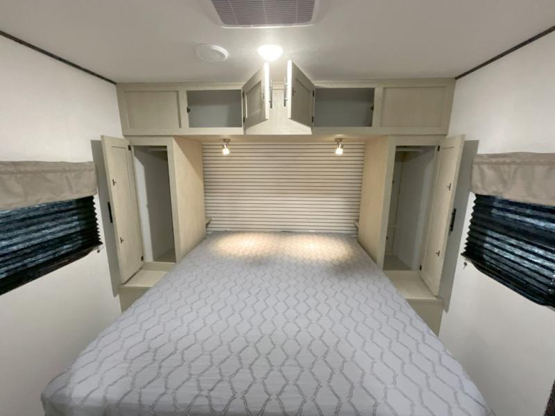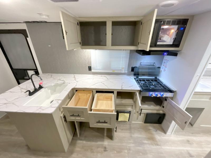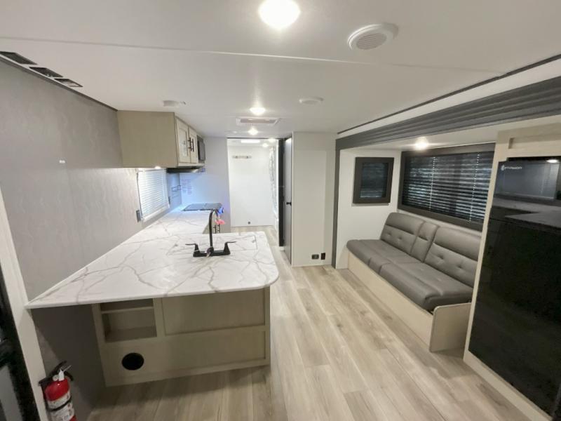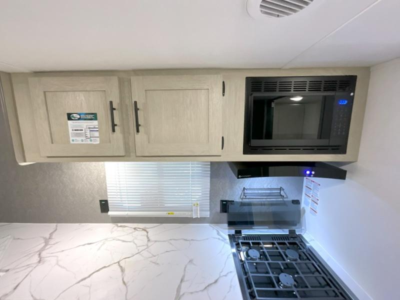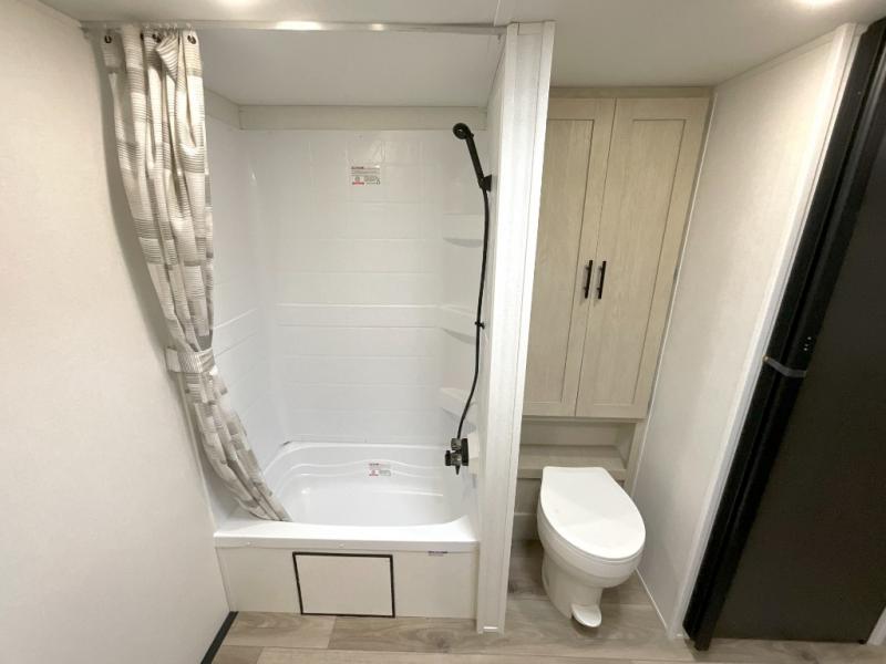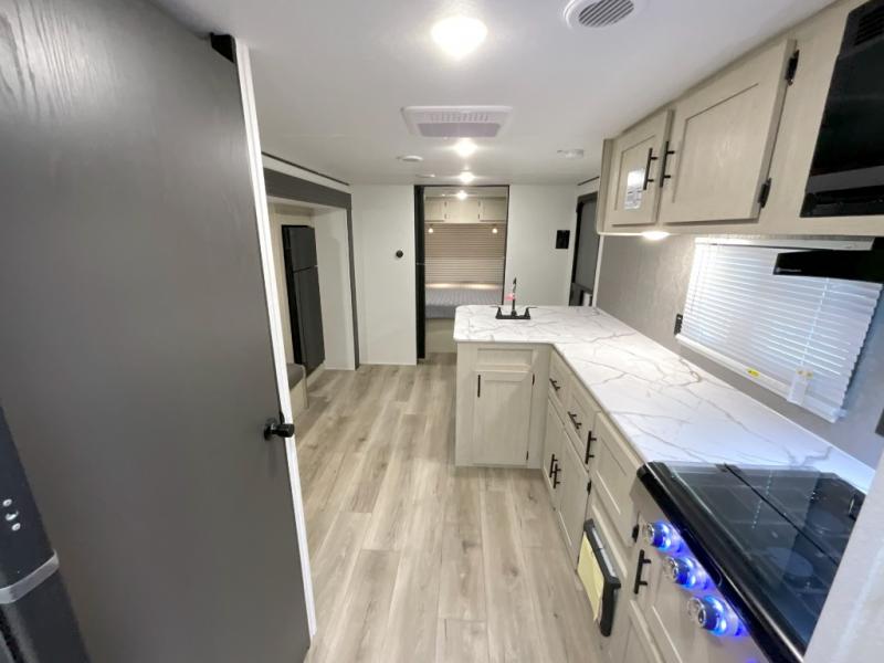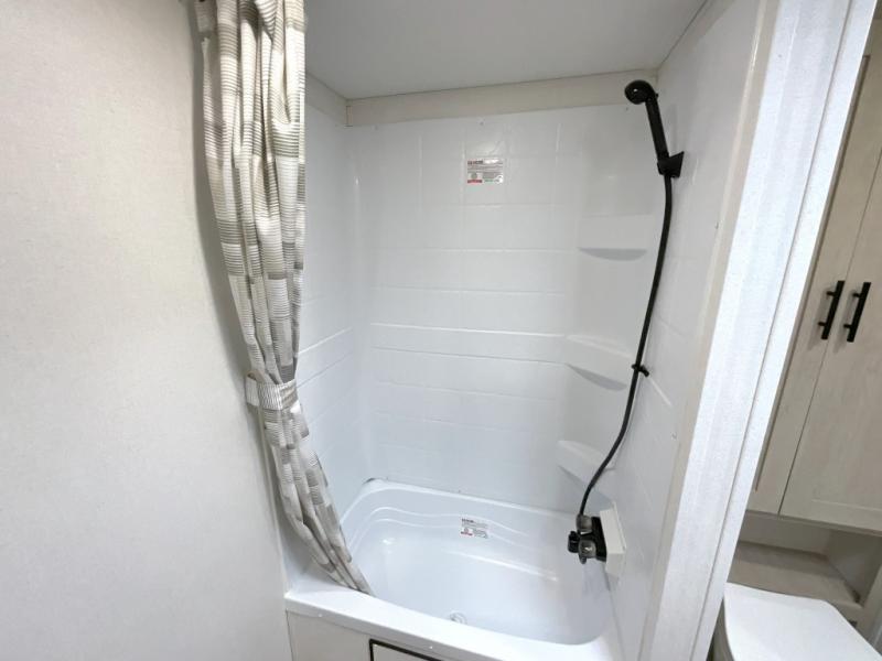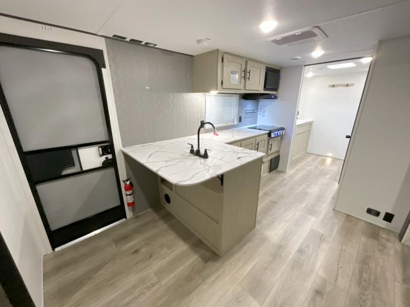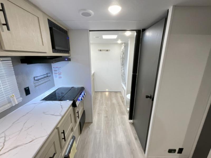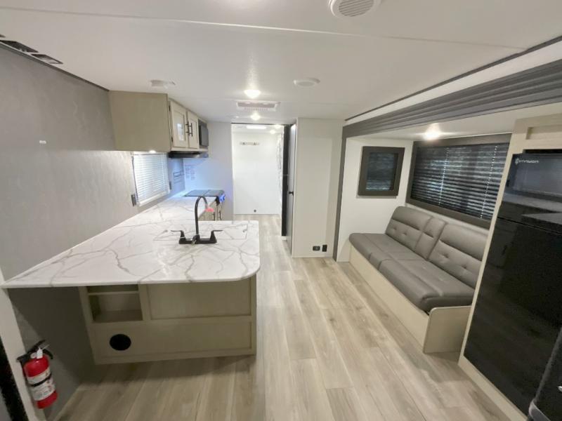 You'll feel right at home in this spacious travel trailer thanks to the large slide out, front bedroom, and full rear bath. There is a 24" x 40" tub, a toilet with partitions, and dual bath sinks with a mirror which allow you both to get ready for bed at once. The fully-equipped interior kitchen includes generous counter space to prep meals, and the outside kitchen will be perfect when the weather is nice. A large pantry will give you a place to store food, paper products, and more, plus this space is washer/dryer ready if you choose to add those appliances.