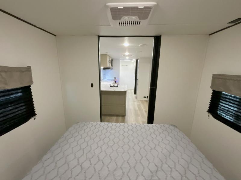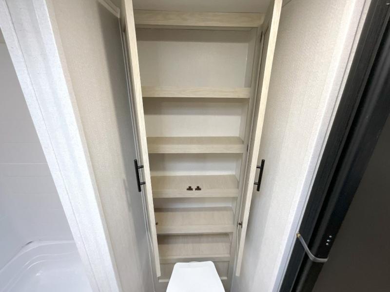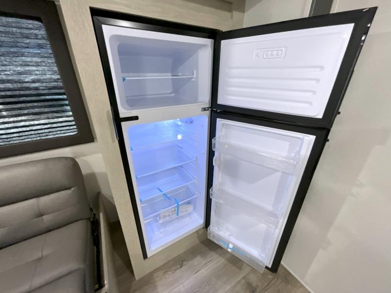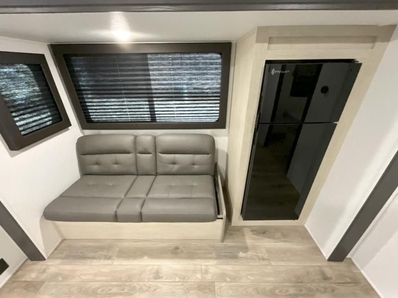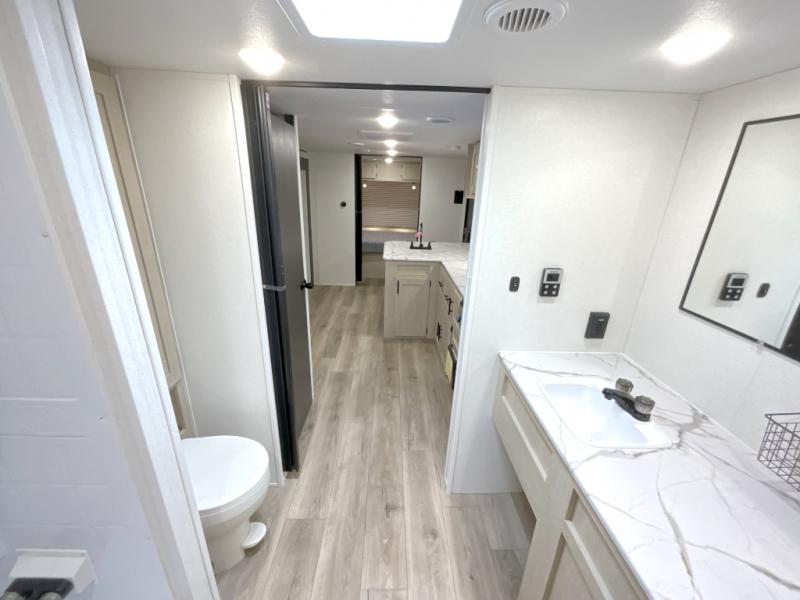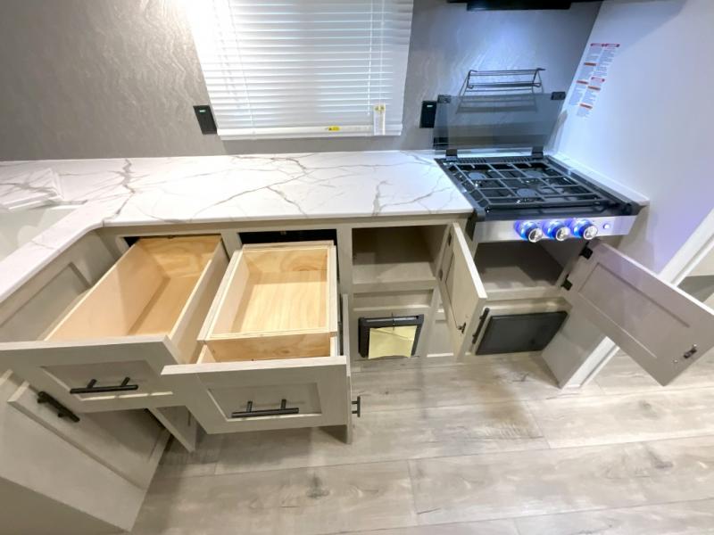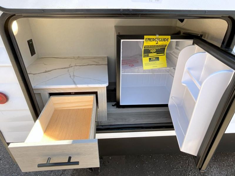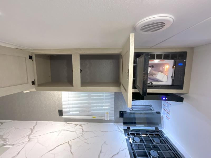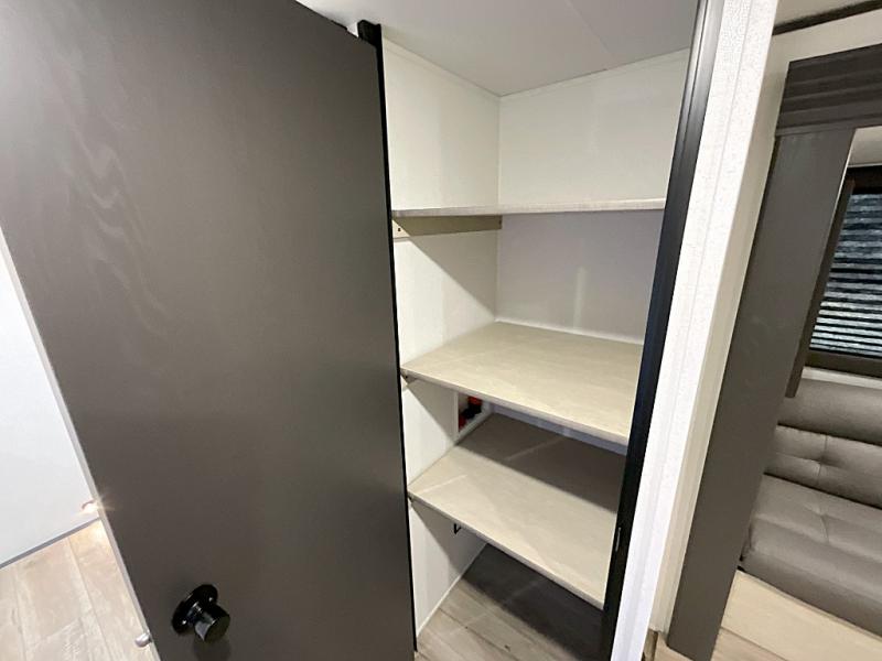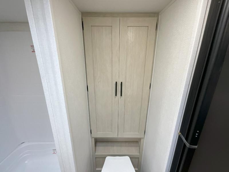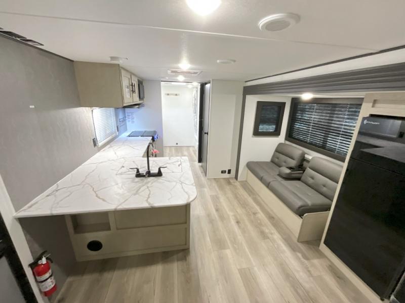 You'll feel right at home in this spacious travel trailer thanks to the large slide out, front bedroom, and full rear bath. There is a 24" x 40" tub, a toilet with partitions, and dual bath sinks with a mirror which allow you both to get ready for bed at once. The fully-equipped interior kitchen includes generous counter space to prep meals, and the outside kitchen will be perfect when the weather is nice. A large pantry will give you a place to store food, paper products, and more, plus this space is washer/dryer ready if you choose to add those appliances.