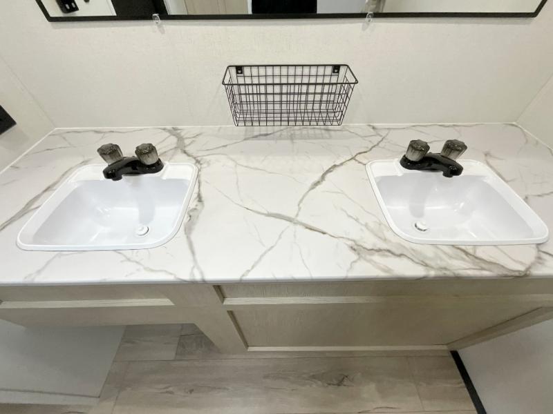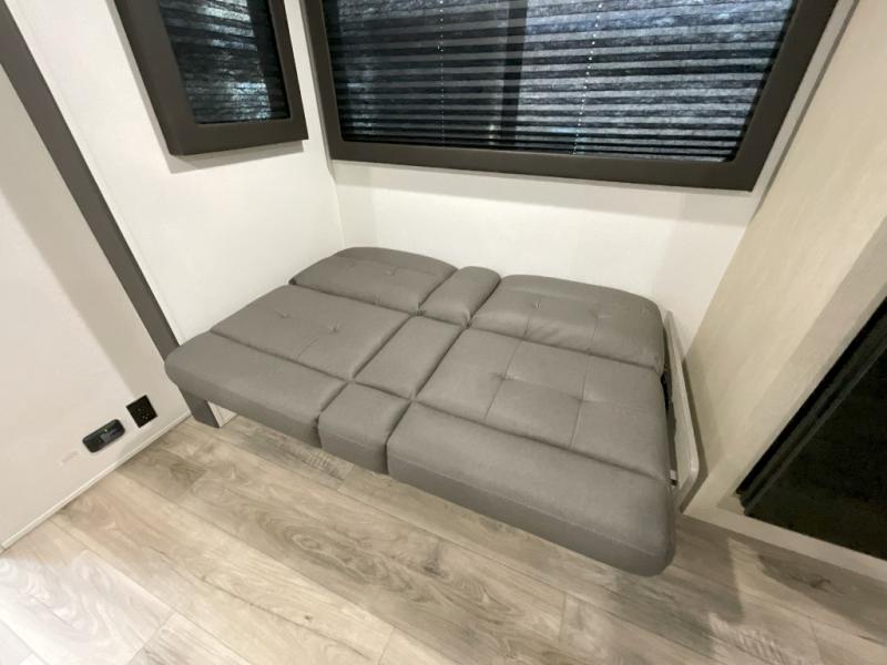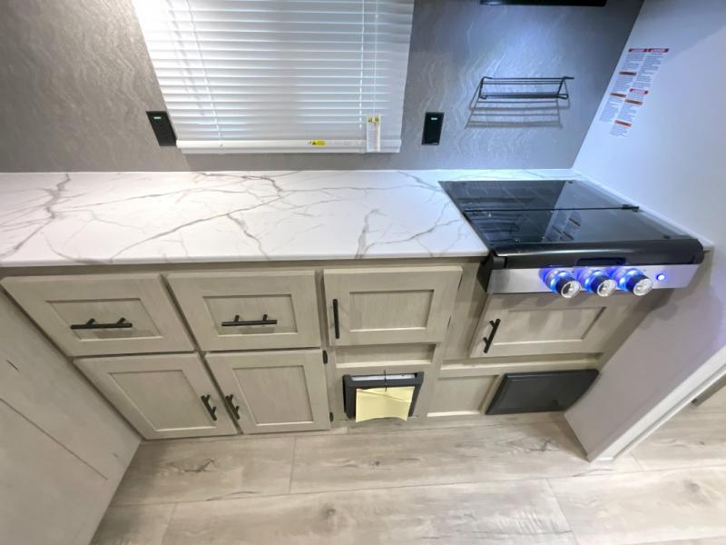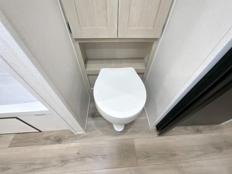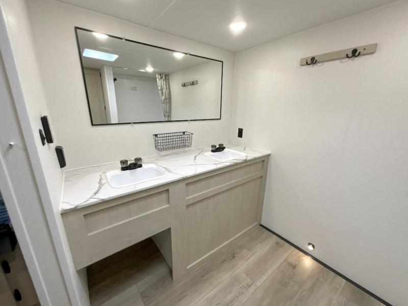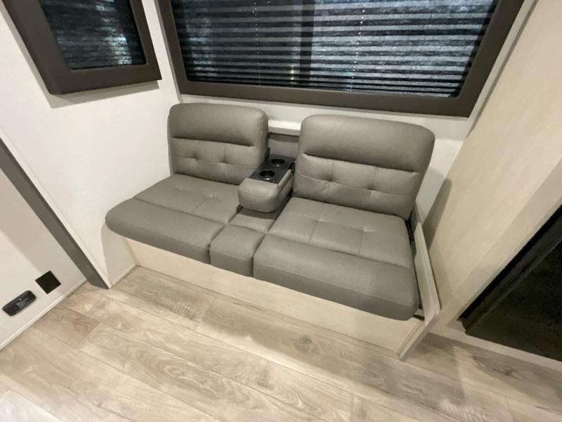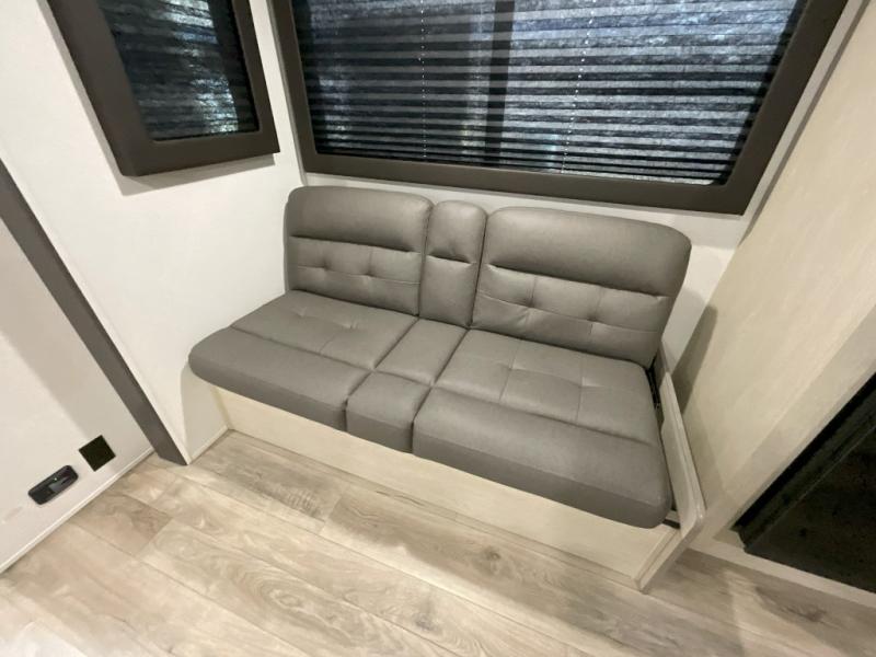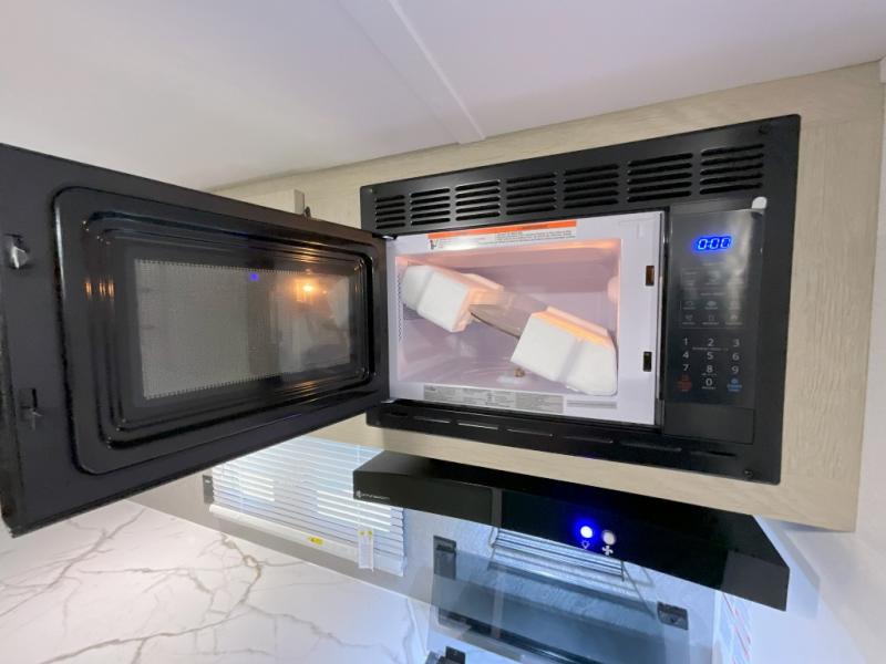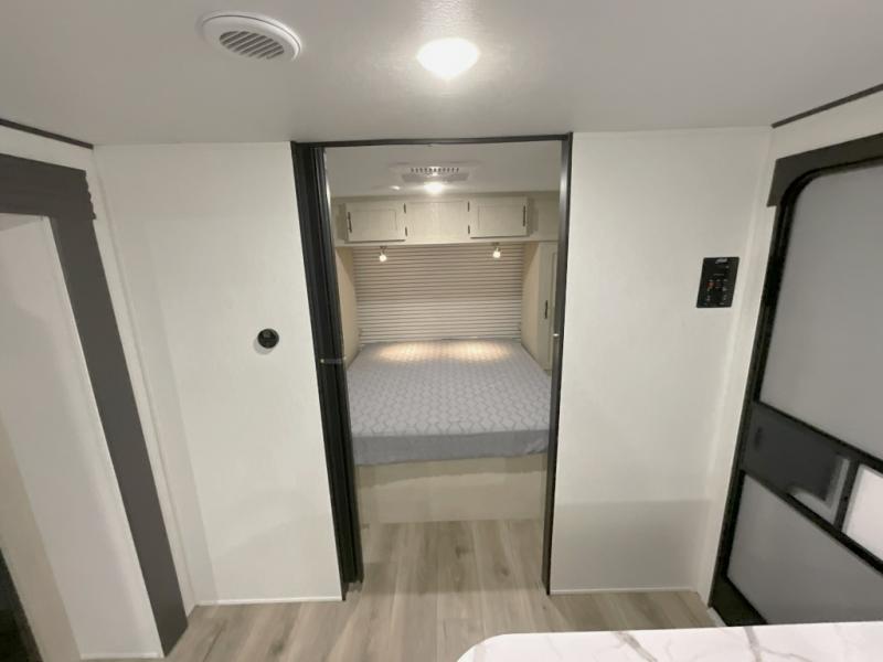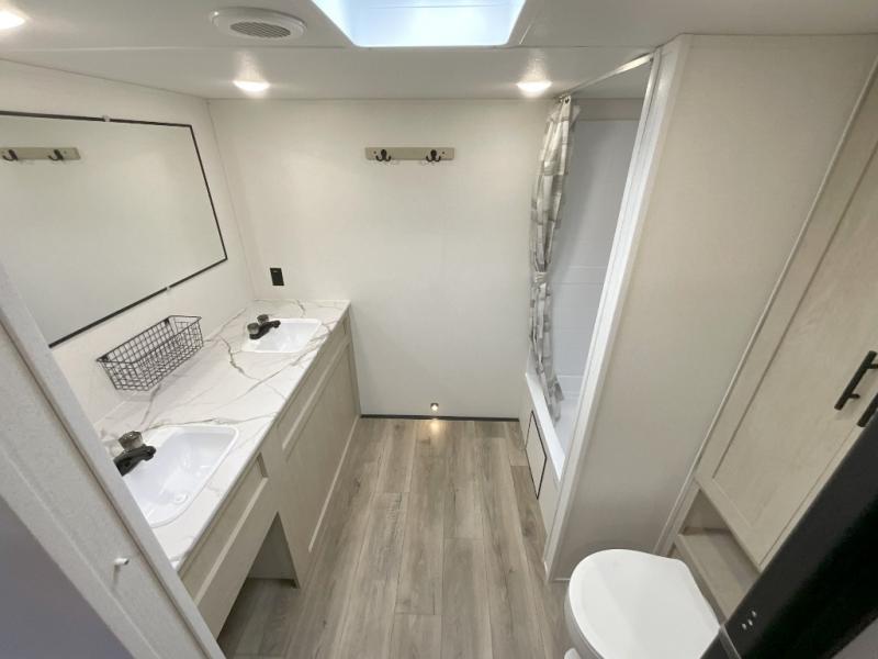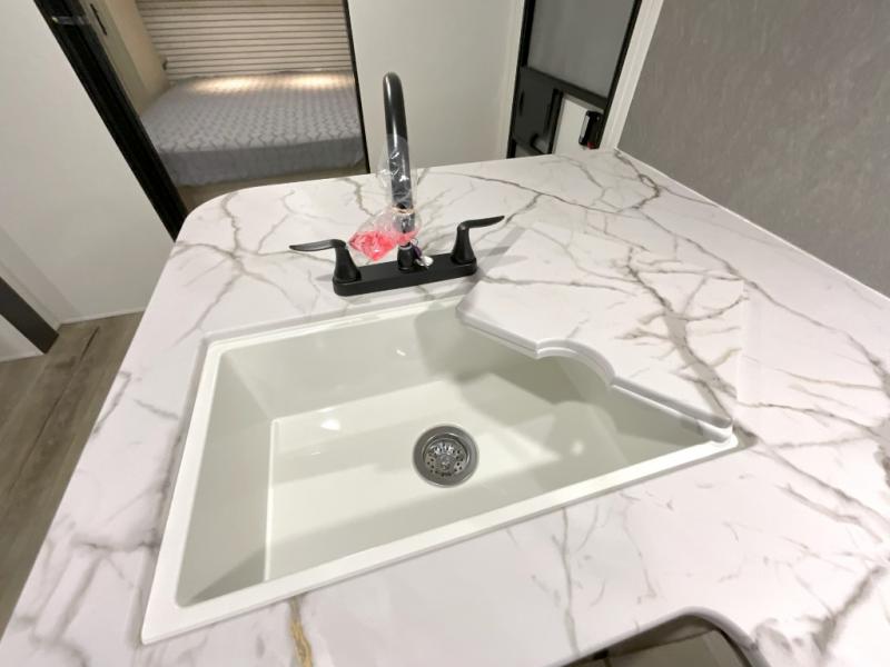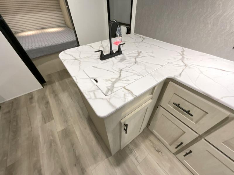 You'll feel right at home in this spacious travel trailer thanks to the large slide out, front bedroom, and full rear bath. There is a 24" x 40" tub, a toilet with partitions, and dual bath sinks with a mirror which allow you both to get ready for bed at once. The fully-equipped interior kitchen includes generous counter space to prep meals, and the outside kitchen will be perfect when the weather is nice. A large pantry will give you a place to store food, paper products, and more, plus this space is washer/dryer ready if you choose to add those appliances.