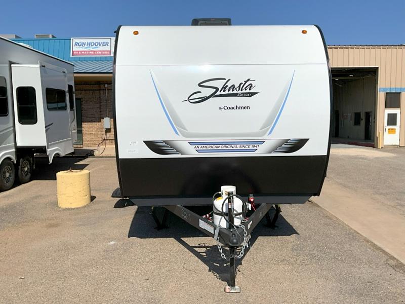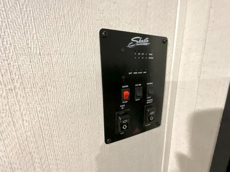 In any Shasta i-5 Edition travel trailer, you will find quality craftsmanship along with an affordable price tag. These units each feature four stabilizer jacks to make setting up easier and an enclosed underbelly for added protection as you travel. The Base Camp Package provides each unit with black tank flush, a monitor panel for quick access to the functions of your unit, a 13.5K A/C unit, and a tankless water heater for added convenience. Inside, you'll find seamless countertops, sink covers, a portable Bluetooth speaker, and more comforts!