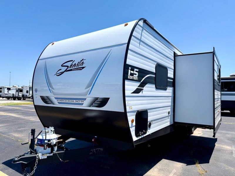 In any Shasta i-5 Edition travel trailer, you will find quality craftsmanship along with an affordable price tag. These units each feature four stabilizer jacks to make setting up easier and an enclosed underbelly for added protection as you travel. The Base Camp Package provides each unit with black tank flush, a monitor panel for quick access to the functions of your unit, a 13.5K A/C unit, and a tankless water heater for added convenience. Inside, you'll find seamless countertops, sink covers, a portable Bluetooth speaker, and more comforts!