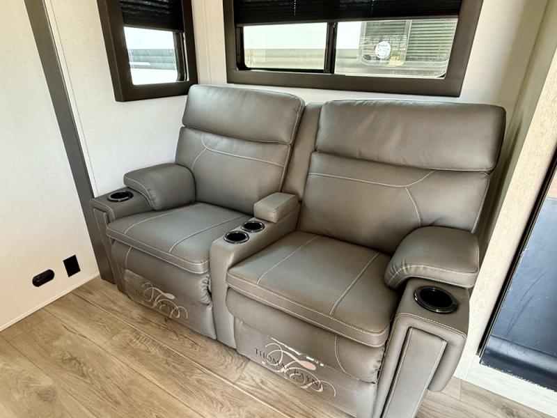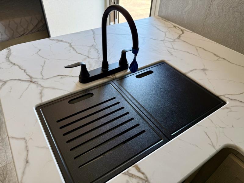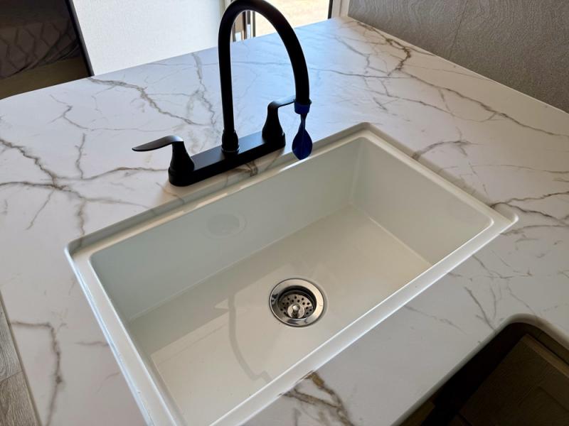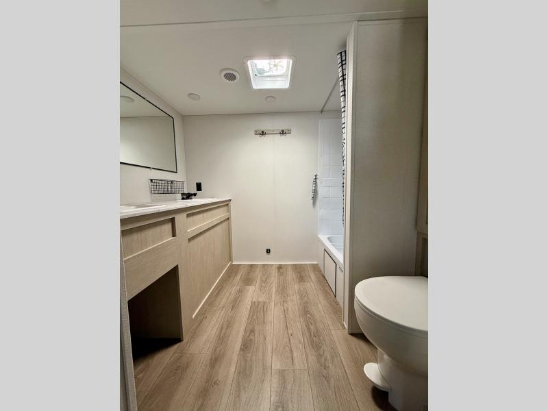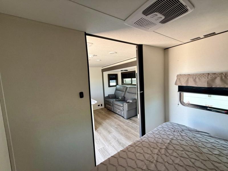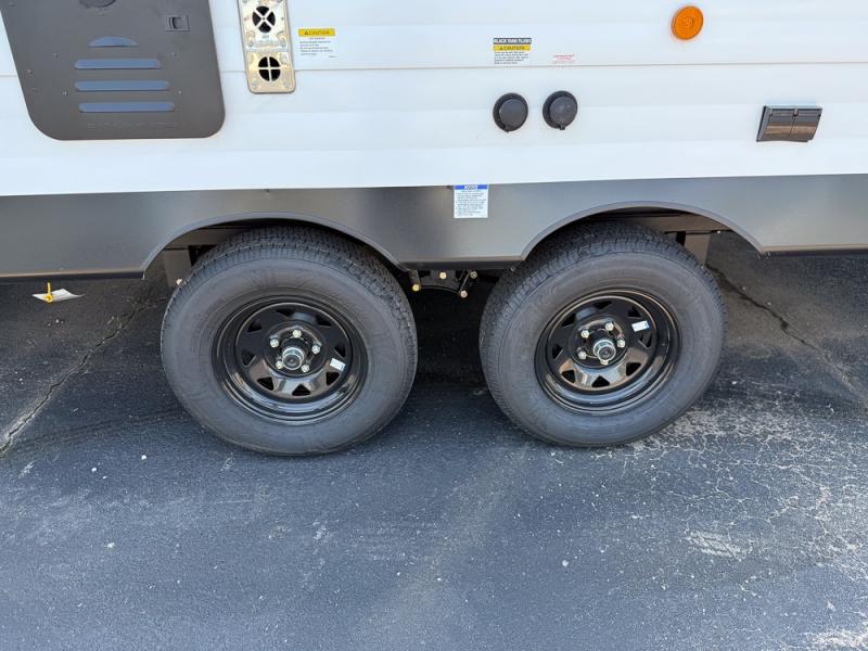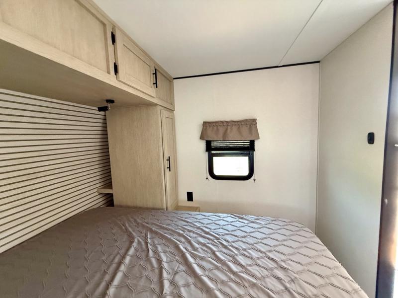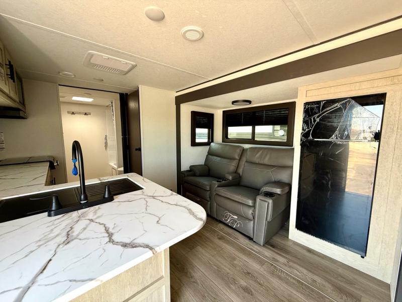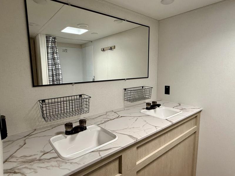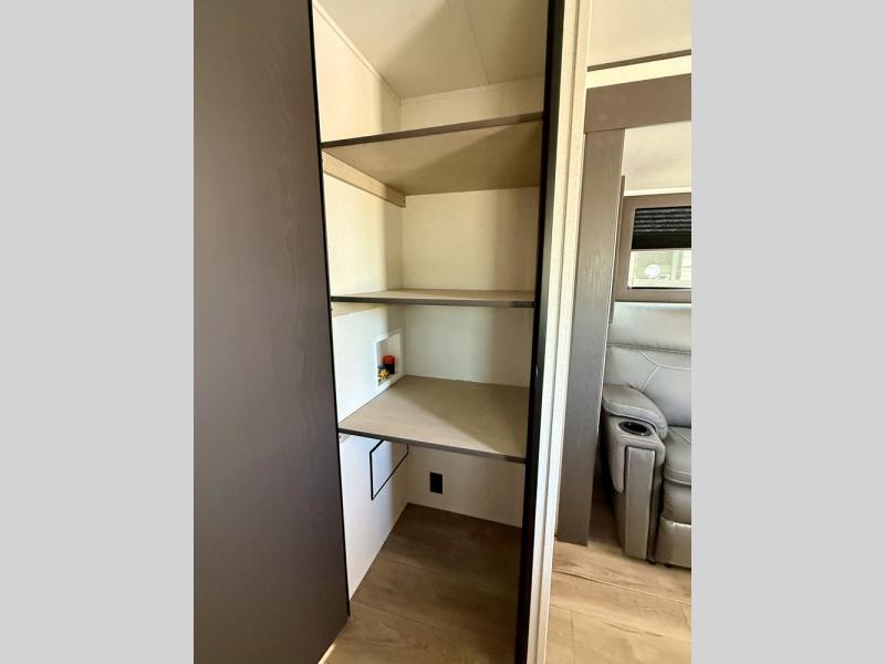 You'll feel right at home in this spacious travel trailer thanks to the large slide out, front bedroom, and full rear bath. There is a 24" x 40" tub, a toilet with partitions, and dual bath sinks with a mirror which allow you both to get ready for bed at once. The fully-equipped interior kitchen includes generous counter space to prep meals, and the outside kitchen will be perfect when the weather is nice. A large pantry will give you a place to store food, paper products, and more, plus this space is washer/dryer ready if you choose to add those appliances.