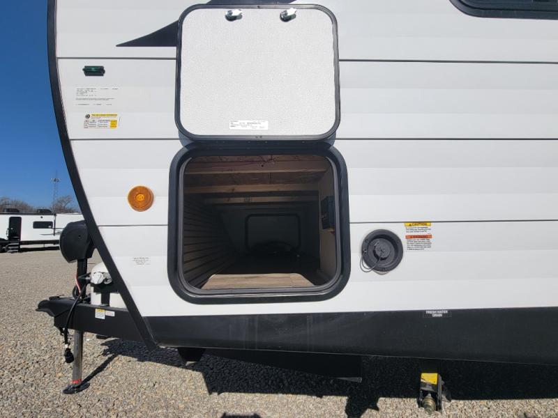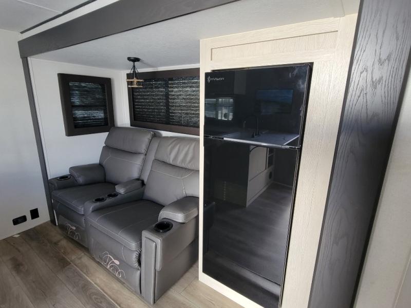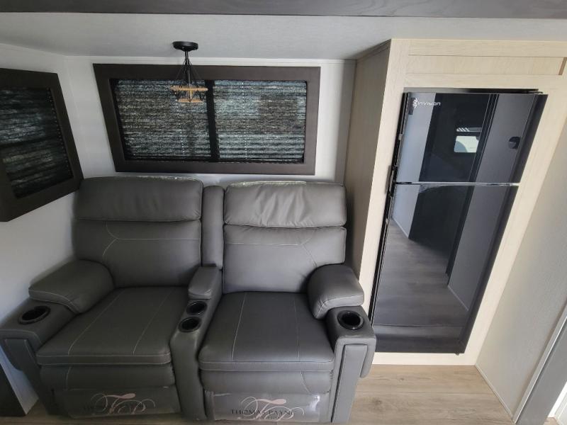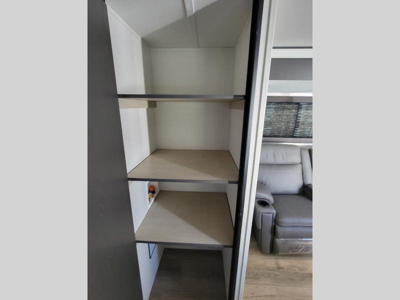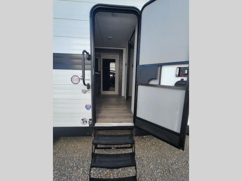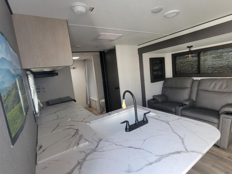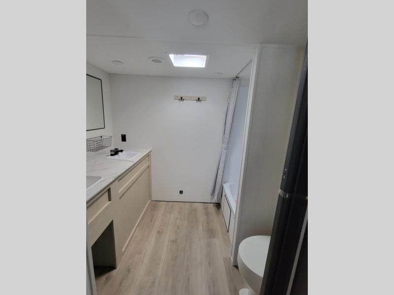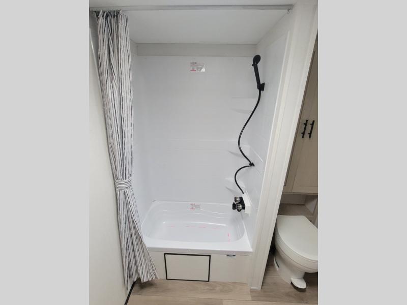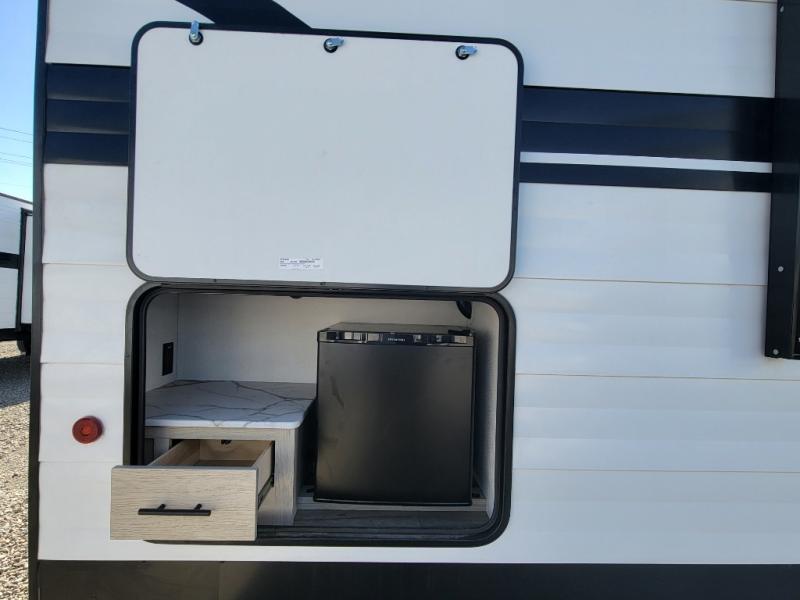 You'll feel right at home in this spacious travel trailer thanks to the large slide out, front bedroom, and full rear bath. There is a 24" x 40" tub, a toilet with partitions, and dual bath sinks with a mirror which allow you both to get ready for bed at once. The fully-equipped interior kitchen includes generous counter space to prep meals, and the outside kitchen will be perfect when the weather is nice. A large pantry will give you a place to store food, paper products, and more, plus this space is washer/dryer ready if you choose to add those appliances.