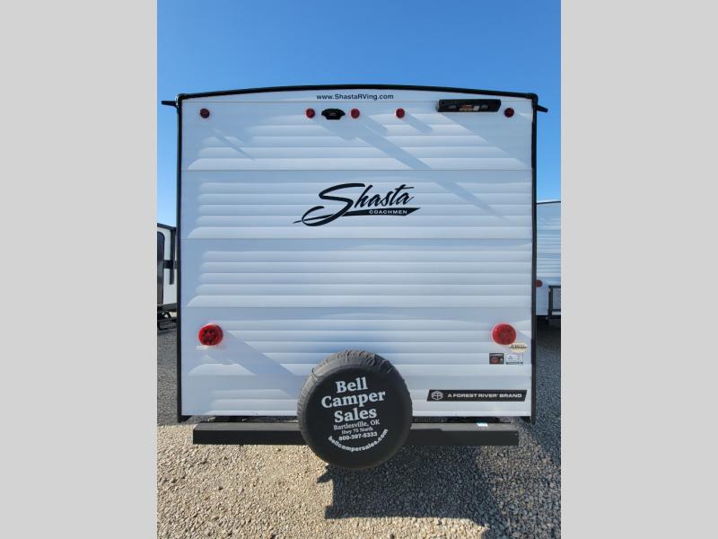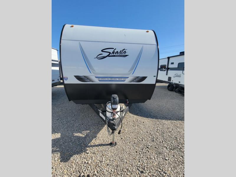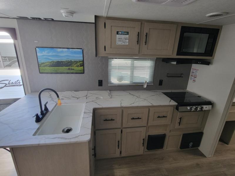 In any Shasta i-5 Edition travel trailer, you will find quality craftsmanship along with an affordable price tag. These units each feature four stabilizer jacks to make setting up easier and an enclosed underbelly for added protection as you travel. The Base Camp Package provides each unit with black tank flush, a monitor panel for quick access to the functions of your unit, a 13.5K A/C unit, and a tankless water heater for added convenience. Inside, you'll find seamless countertops, sink covers, a portable Bluetooth speaker, and more comforts!