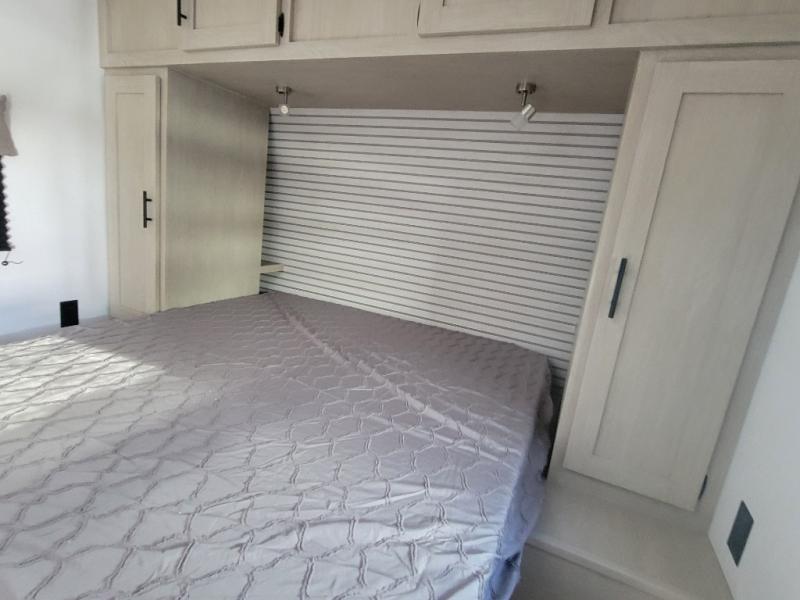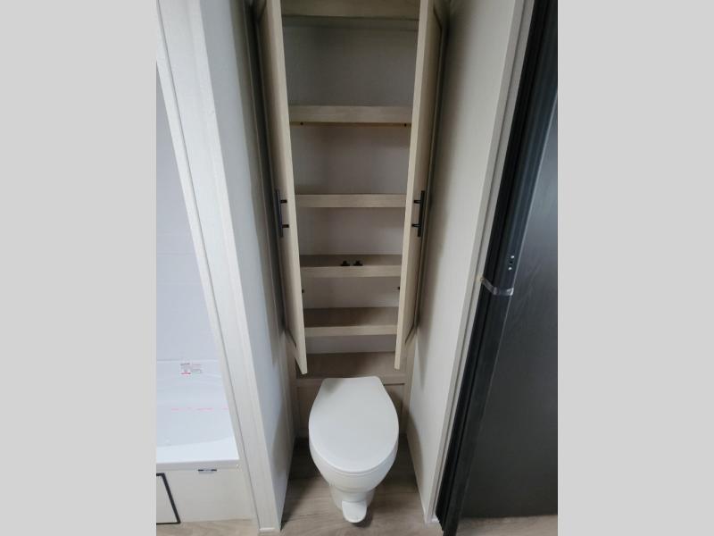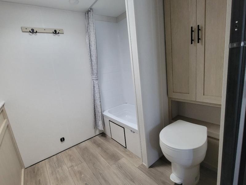 You'll feel right at home in this spacious travel trailer thanks to the large slide out, front bedroom, and full rear bath. There is a 24" x 40" tub, a toilet with partitions, and dual bath sinks with a mirror which allow you both to get ready for bed at once. The fully-equipped interior kitchen includes generous counter space to prep meals, and the outside kitchen will be perfect when the weather is nice. A large pantry will give you a place to store food, paper products, and more, plus this space is washer/dryer ready if you choose to add those appliances.