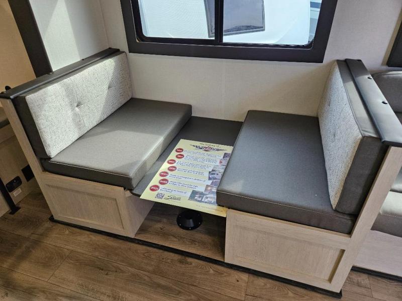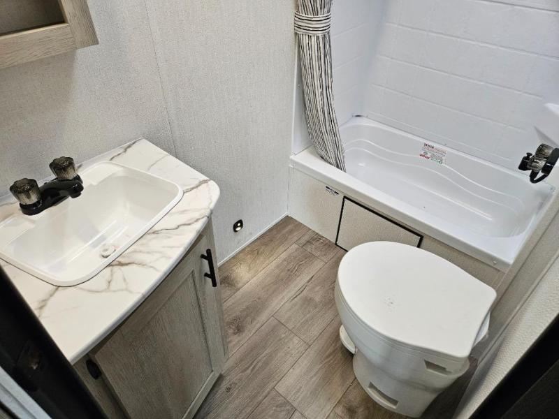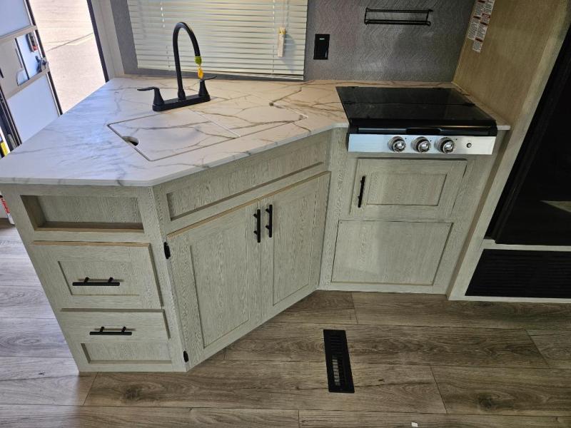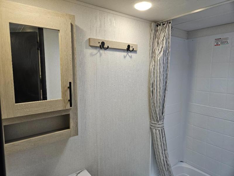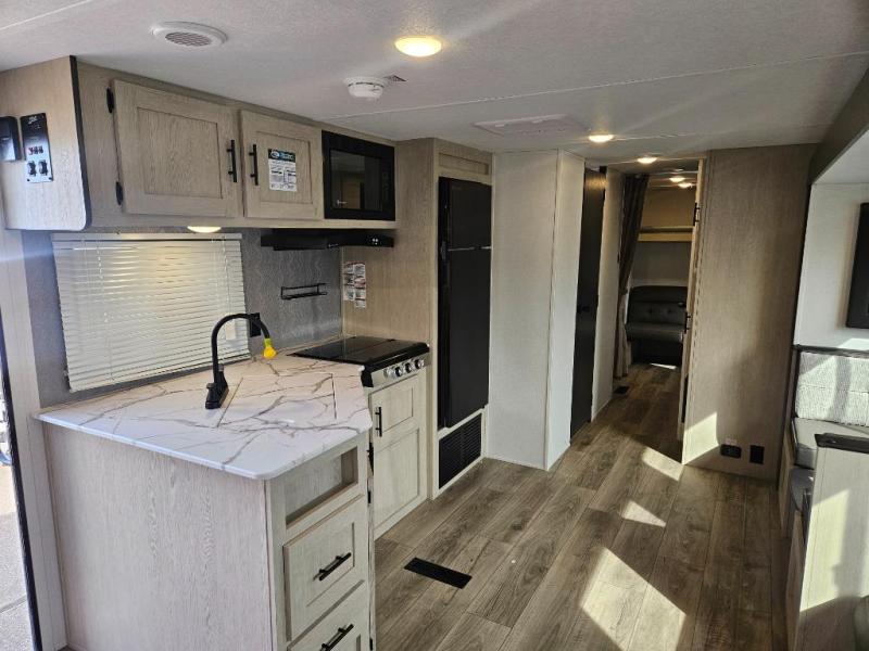 The little ones or your guests will love the bunkhouse in this spacious trailer. There area a set of 26" x 74" bunks, along with a flip-up bunk above a sofa they can sleep and relax. You'll find your own space in the front bedroom that includes a walk-around queen bed and dual wardrobes. Everyone can meet in the middle living area and kitchen to dine around the U-shaped dinette or relax on the sofa. The chef will be able to create delicious meals each day on the three burner cooktop, and there is a residential style refrigerator for perishables. And the mid-coach full bath is sure to come in handy after a day of swimming or hiking!