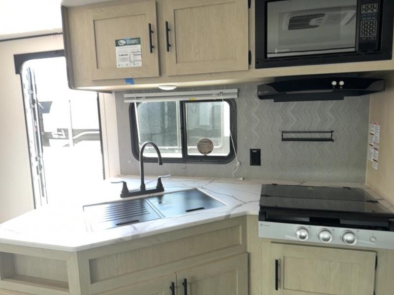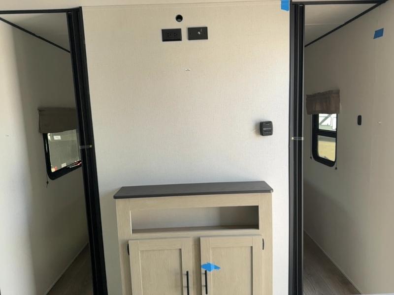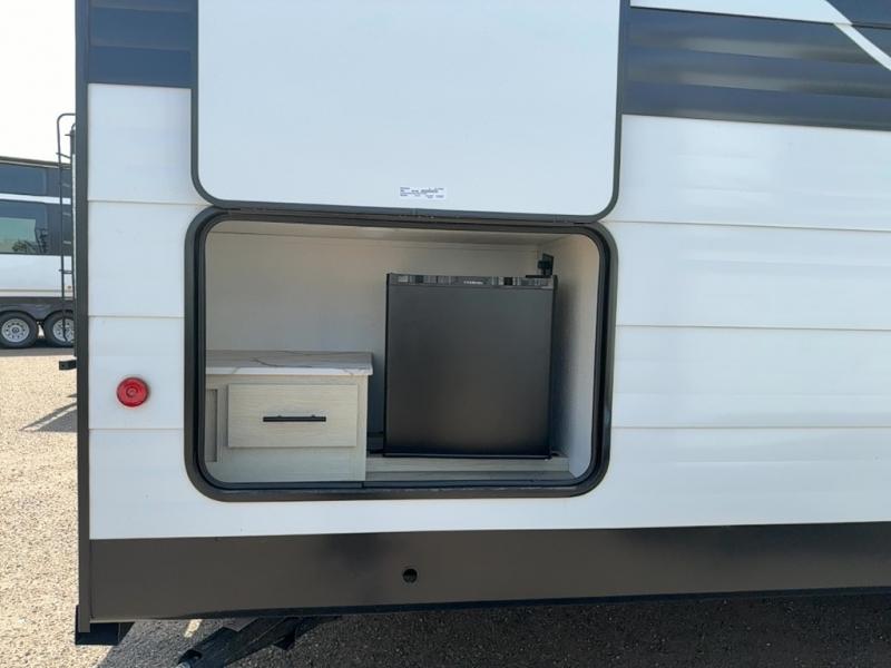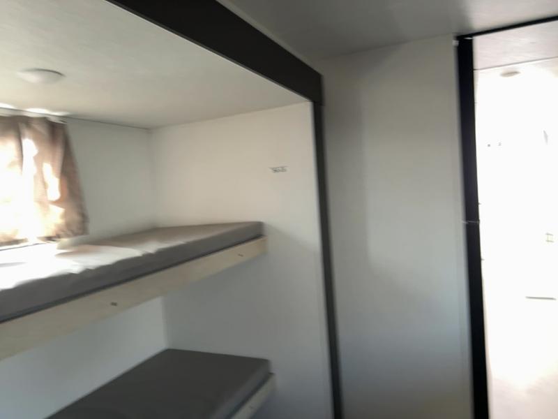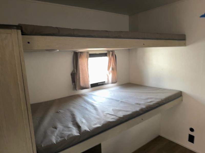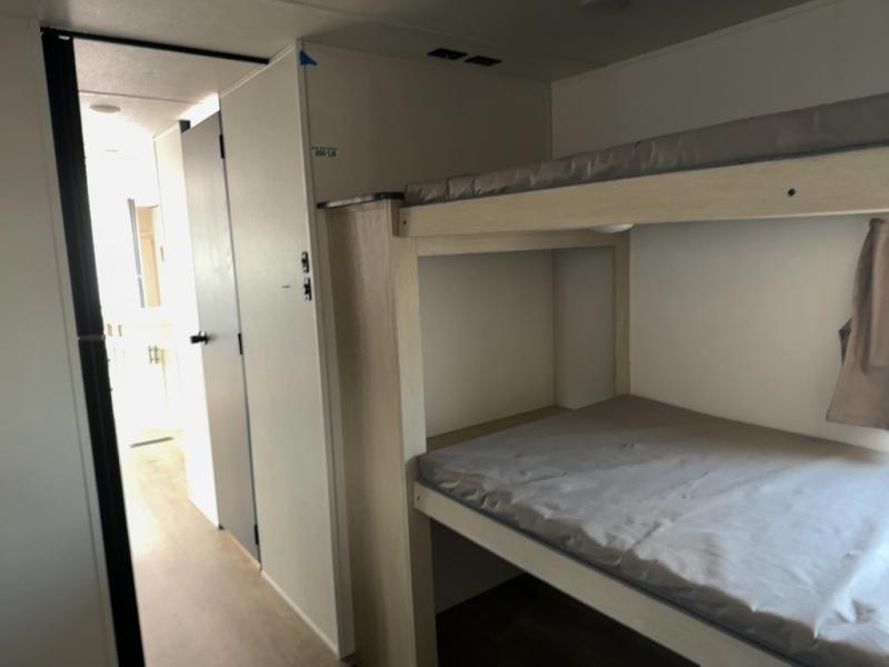 There are a set of 38" x 74" bunks and a set of 26" x 74" bunks in this trailer for lots of sleeping space! This bunkroom also includes a slide out for more space, and you can choose the optional double suite with a 54" x 74" bed if you don't need the bunks. The kitchen is fully equipped for your camping trips featuring a three burner cooktop, an overhead microwave oven, a large sink, and plenty of storage space. You will also love the pantry for all of your canned goods and snacks. The bath features a 24" x 40" shower, toilet, and vanity/sink. In the front of this unit, a private bedroom provides a quiet retreat from the rest of the unit with dual entry doors, and you'll appreciate having dual bedroom wardrobes to keep your clothes organized. Outside, enjoy pass-through storage for all of your outdoor camping gear plus more.