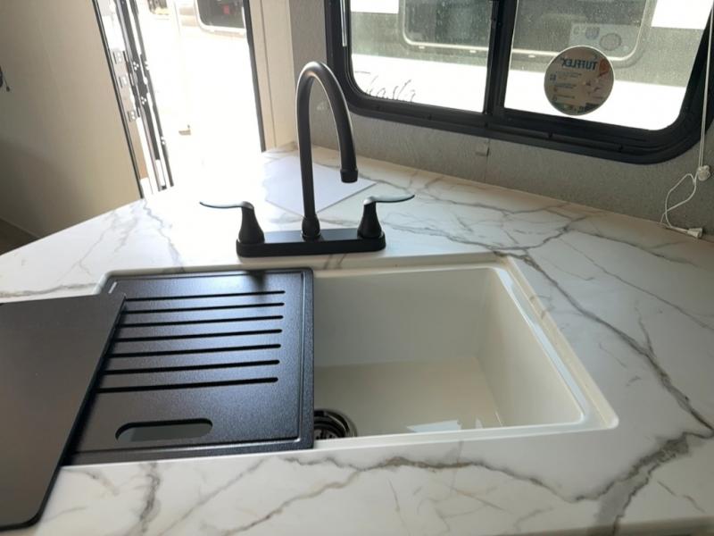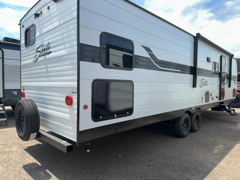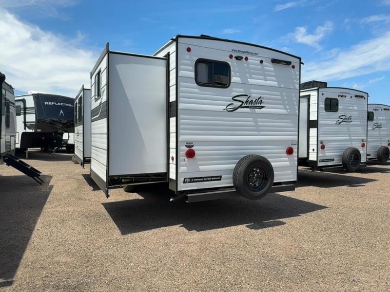 In any Shasta i-5 Edition travel trailer, you will find quality craftsmanship along with an affordable price tag. These units each feature four stabilizer jacks to make setting up easier and an enclosed underbelly for added protection as you travel. The Base Camp Package provides each unit with black tank flush, a monitor panel for quick access to the functions of your unit, a 13.5K A/C unit, and a tankless water heater for added convenience. Inside, you'll find seamless countertops, sink covers, a portable Bluetooth speaker, and more comforts!