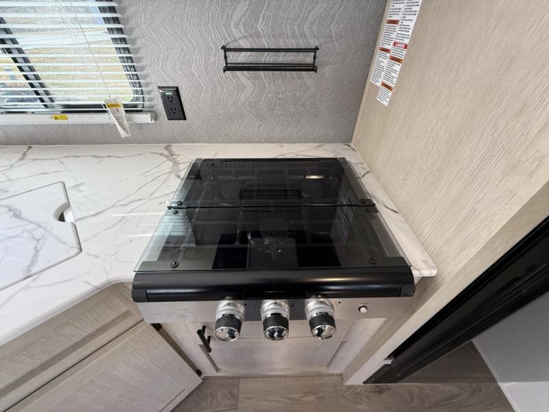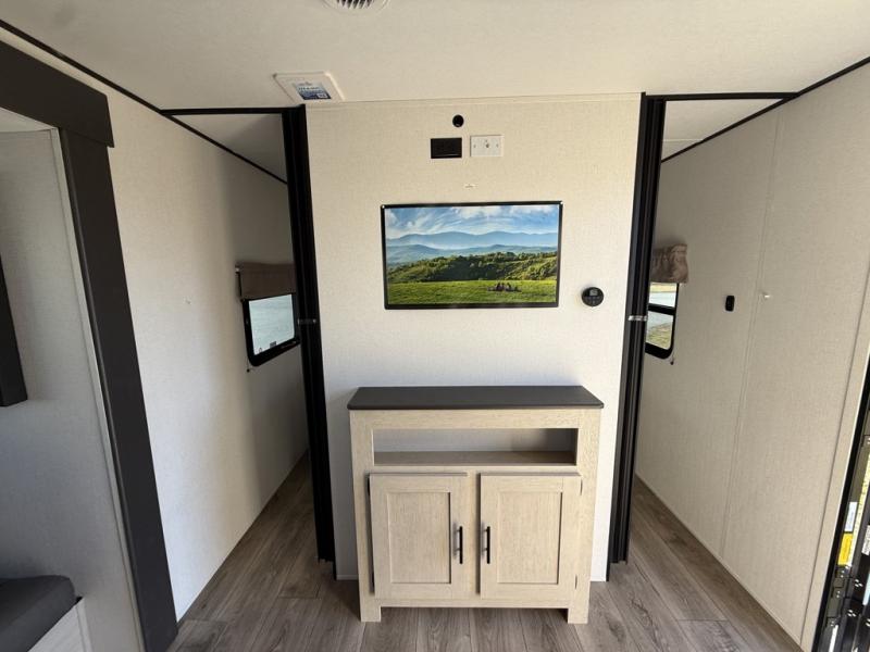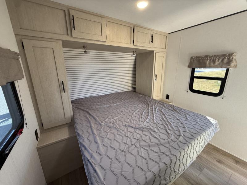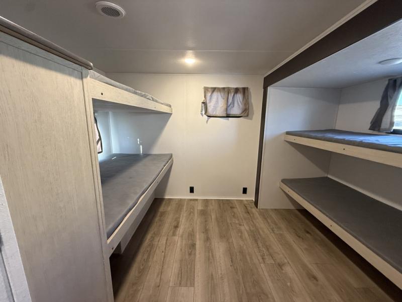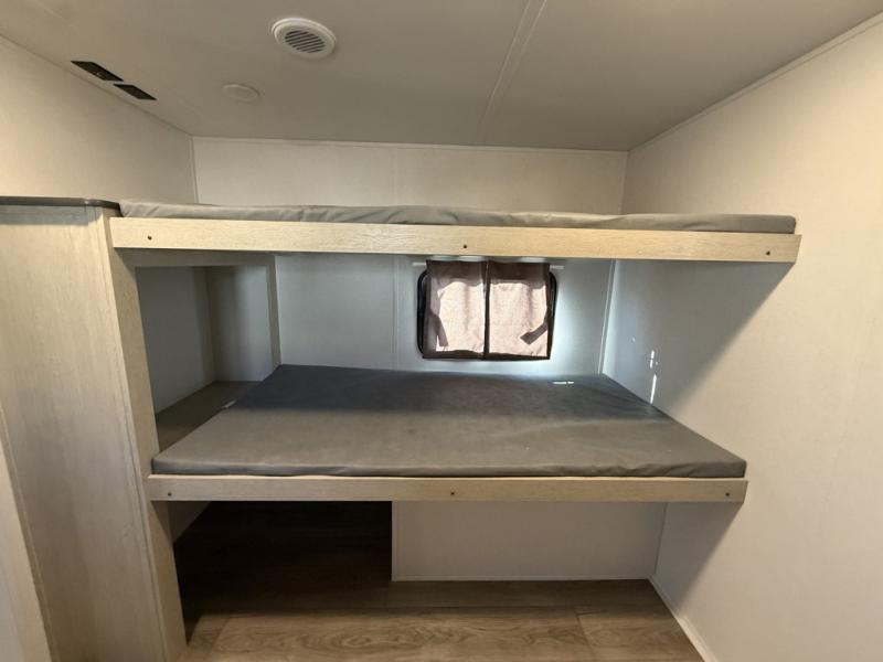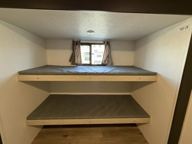 There are a set of 38" x 74" bunks and a set of 26" x 74" bunks in this trailer for lots of sleeping space! This bunkroom also includes a slide out for more space, and you can choose the optional double suite with a 54" x 74" bed if you don't need the bunks. The kitchen is fully equipped for your camping trips featuring a three burner cooktop, an overhead microwave oven, a large sink, and plenty of storage space. You will also love the pantry for all of your canned goods and snacks. The bath features a 24" x 40" shower, toilet, and vanity/sink. In the front of this unit, a private bedroom provides a quiet retreat from the rest of the unit with dual entry doors, and you'll appreciate having dual bedroom wardrobes to keep your clothes organized. Outside, enjoy pass-through storage for all of your outdoor camping gear plus more.