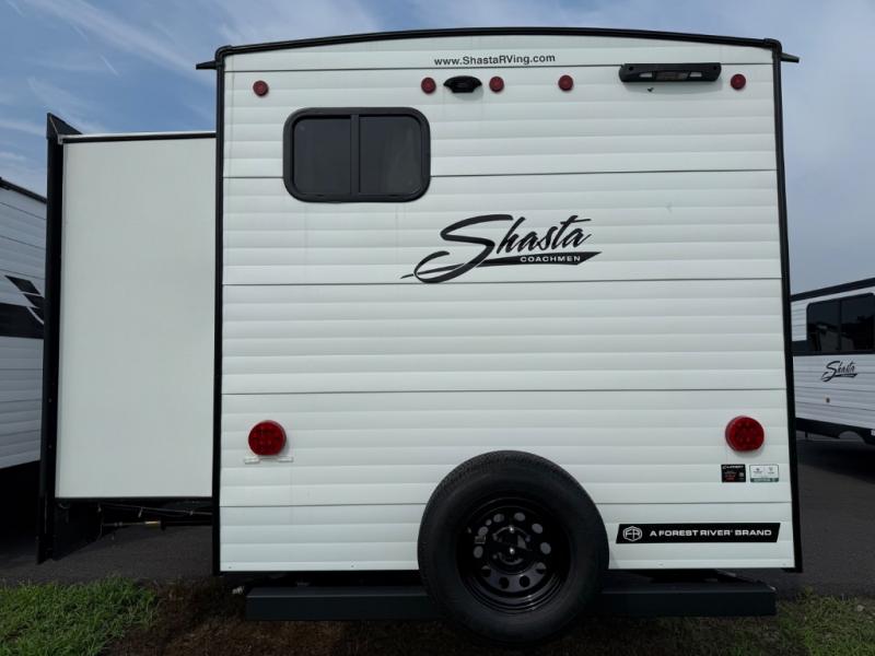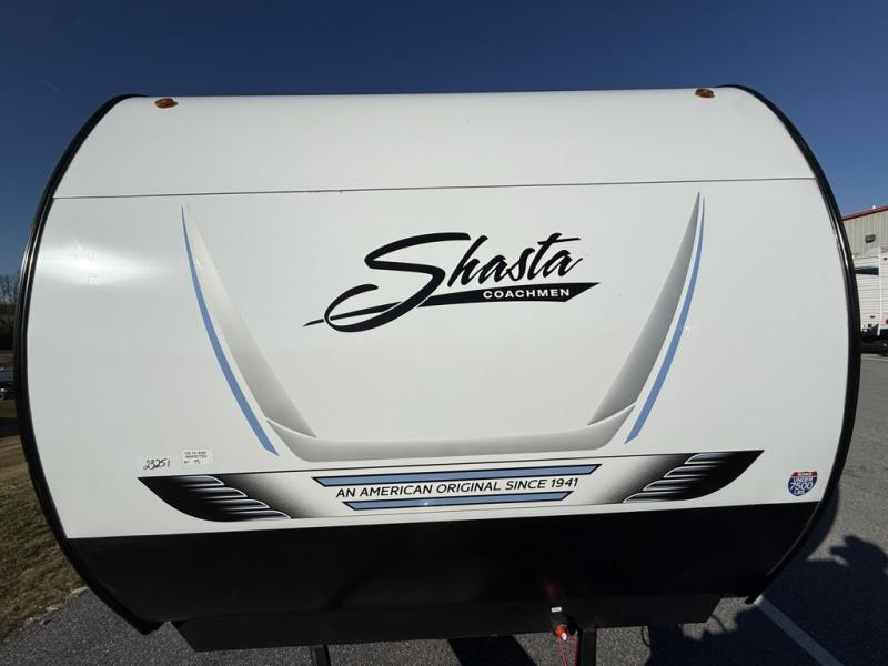 In any Shasta i-5 Edition travel trailer, you will find quality craftsmanship along with an affordable price tag. These units each feature four stabilizer jacks to make setting up easier and an enclosed underbelly for added protection as you travel. The Base Camp Package provides each unit with black tank flush, a monitor panel for quick access to the functions of your unit, a 13.5K A/C unit, and a tankless water heater for added convenience. Inside, you'll find seamless countertops, sink covers, a portable Bluetooth speaker, and more comforts!