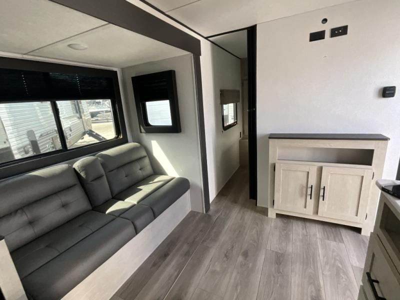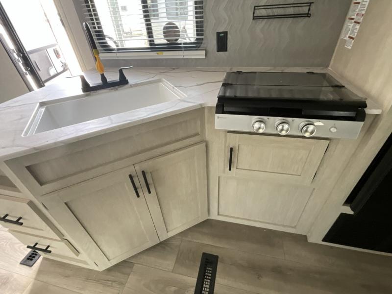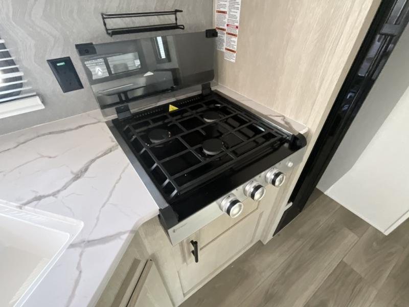 There are a set of 38" x 74" bunks and a set of 26" x 74" bunks in this trailer for lots of sleeping space! This bunkroom also includes a slide out for more space, and you can choose the optional double suite with a 54" x 74" bed if you don't need the bunks. The kitchen is fully equipped for your camping trips featuring a three burner cooktop, an overhead microwave oven, a large sink, and plenty of storage space. You will also love the pantry for all of your canned goods and snacks. The bath features a 24" x 40" shower, toilet, and vanity/sink. In the front of this unit, a private bedroom provides a quiet retreat from the rest of the unit with dual entry doors, and you'll appreciate having dual bedroom wardrobes to keep your clothes organized. Outside, enjoy pass-through storage for all of your outdoor camping gear plus more.
