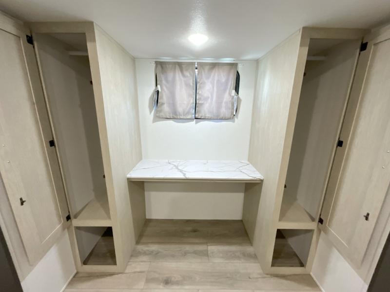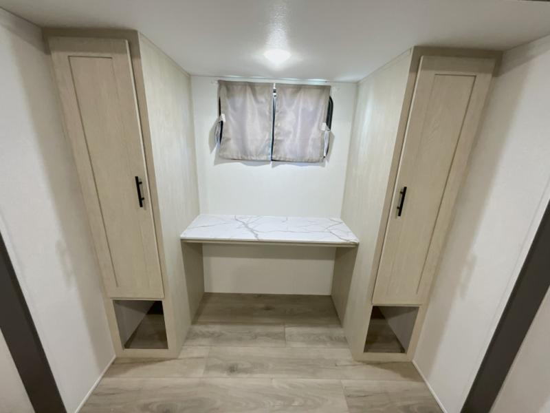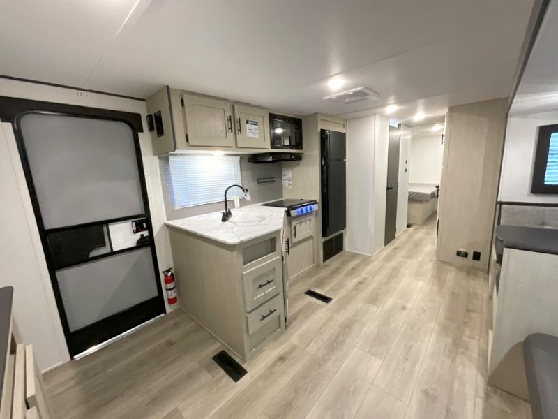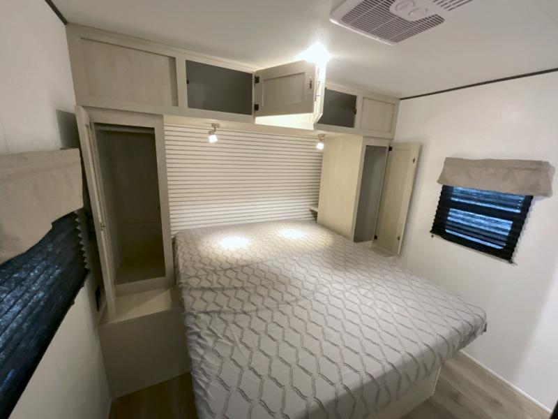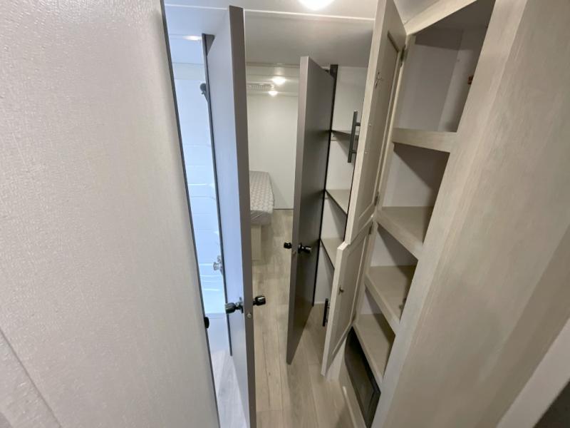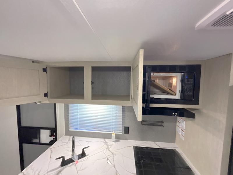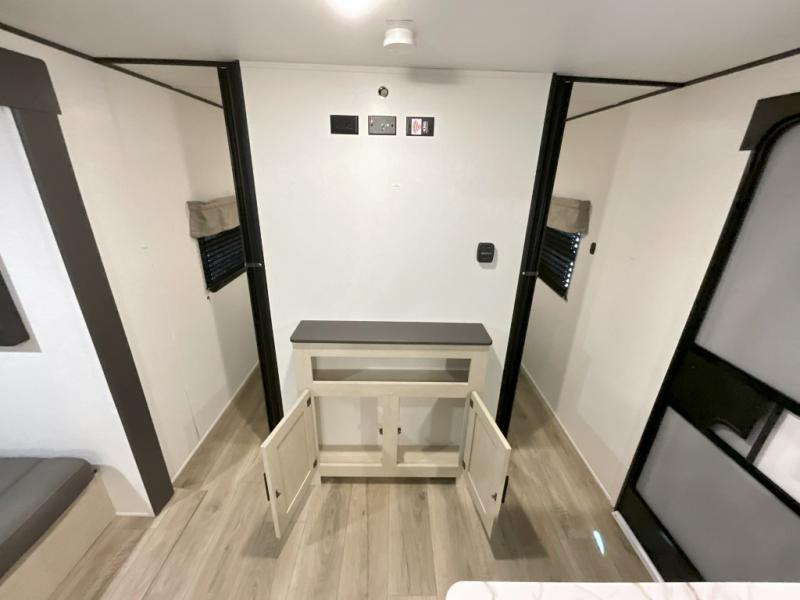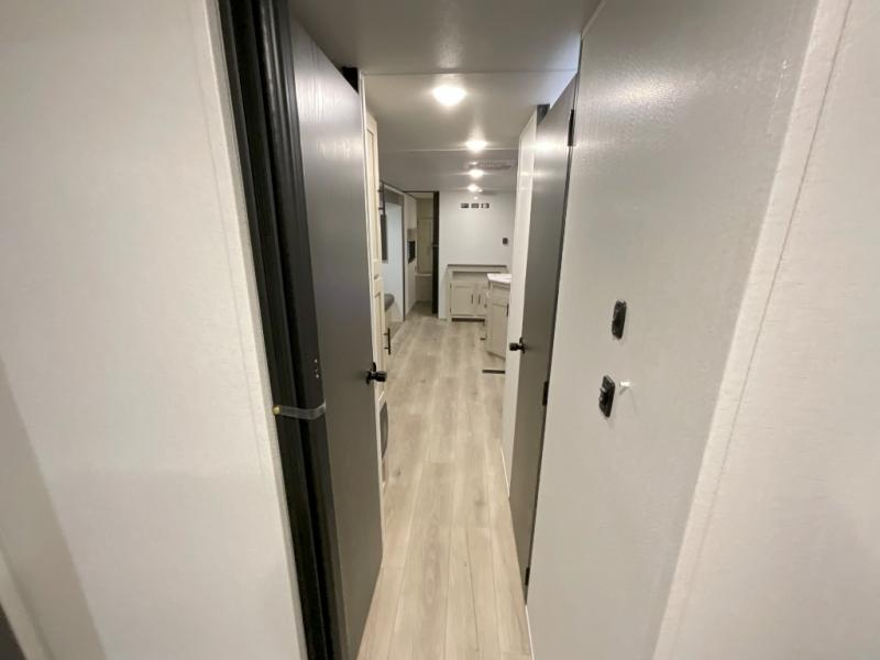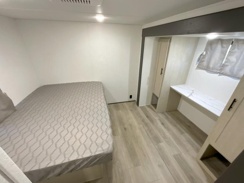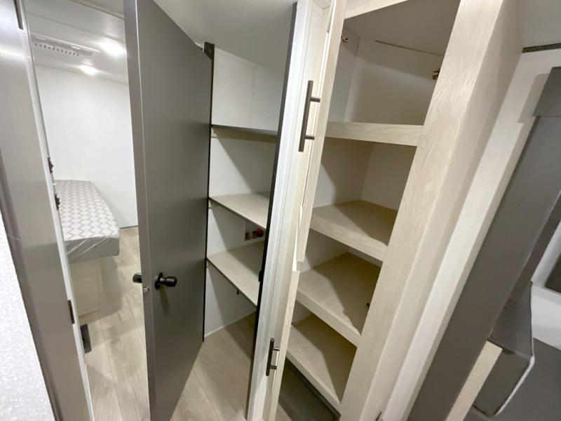 There are a a set of 38" x 74" bunks and a set of 26" x 74" bunks in this trailer for lots of sleeping space! This bunkroom also includes a slide out for more space, and you can choose the optional double suite with a 54" x 74" bed if you don't need the bunks. The kitchen is fully equipped for your camping trips featuring a three burner cooktop, an overhead microwave oven, a large sink, and plenty of storage space. You will also love the pantry for all of your canned goods and snacks. The bath features a 24" x 40" shower, toilet, and vanity/sink. In the front of this unit, a private bedroom provides a quiet retreat from the rest of the unit with dual entry doors, and you'll appreciate having dual bedroom wardrobes to keep your clothes organized. Outside, enjoy pass-through storage for all of your outdoor camping gear plus more.