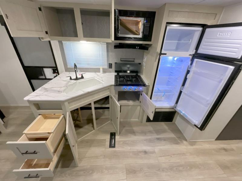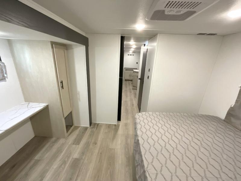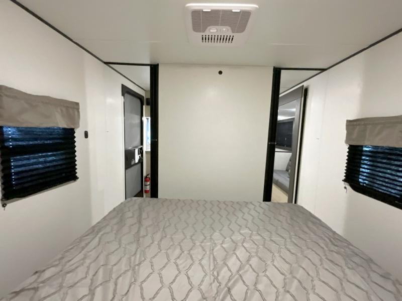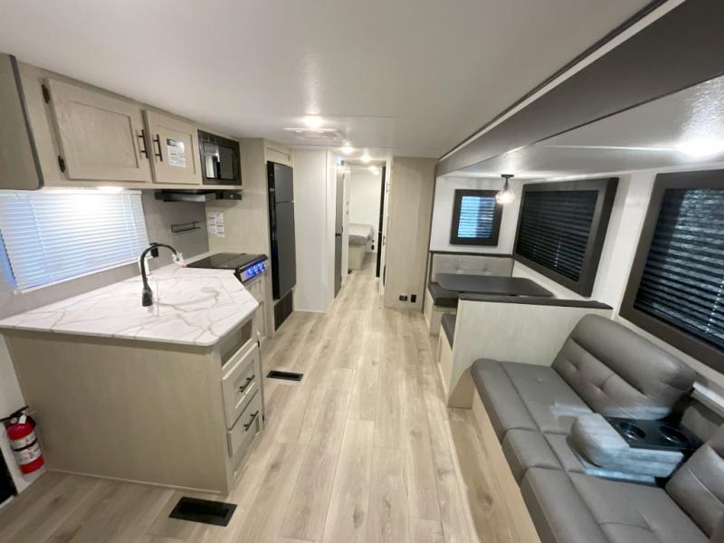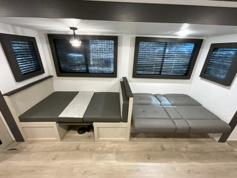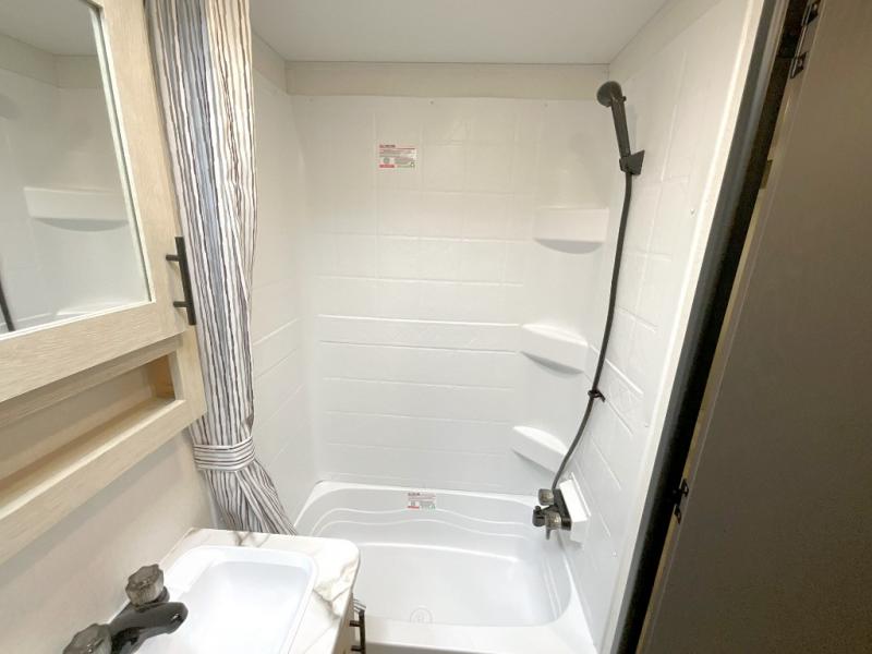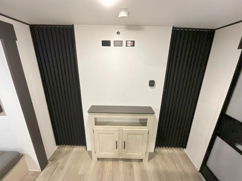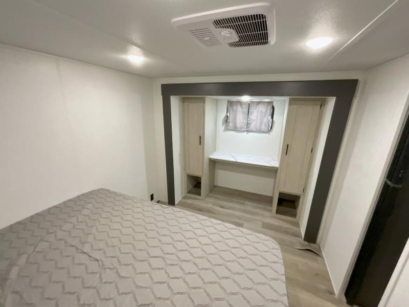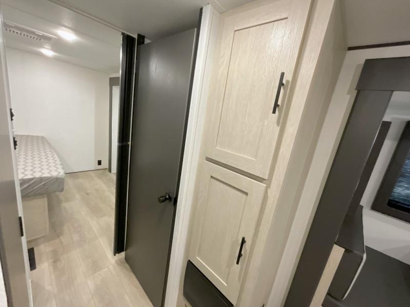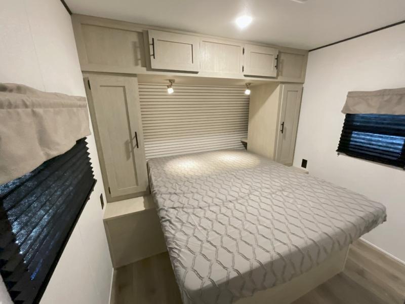 There are a a set of 38" x 74" bunks and a set of 26" x 74" bunks in this trailer for lots of sleeping space! This bunkroom also includes a slide out for more space, and you can choose the optional double suite with a 54" x 74" bed if you don't need the bunks. The kitchen is fully equipped for your camping trips featuring a three burner cooktop, an overhead microwave oven, a large sink, and plenty of storage space. You will also love the pantry for all of your canned goods and snacks. The bath features a 24" x 40" shower, toilet, and vanity/sink. In the front of this unit, a private bedroom provides a quiet retreat from the rest of the unit with dual entry doors, and you'll appreciate having dual bedroom wardrobes to keep your clothes organized. Outside, enjoy pass-through storage for all of your outdoor camping gear plus more.