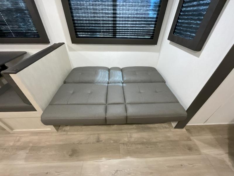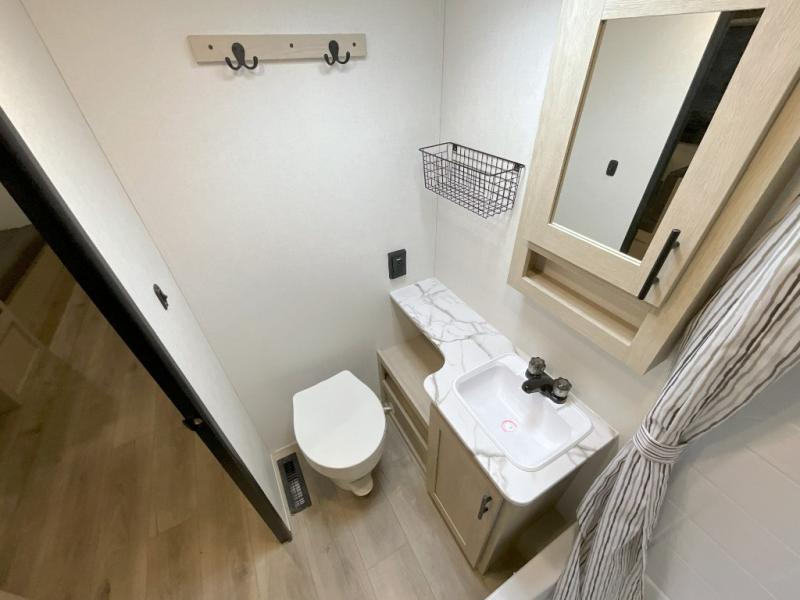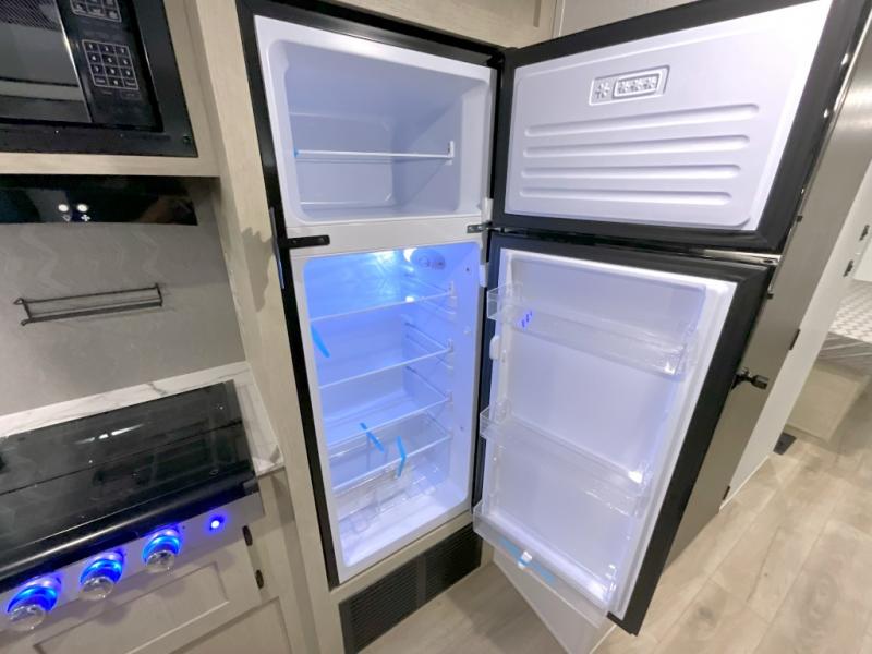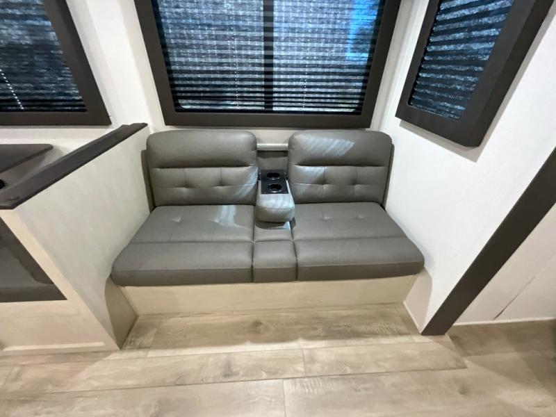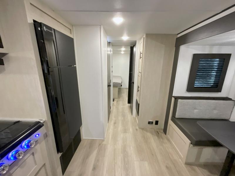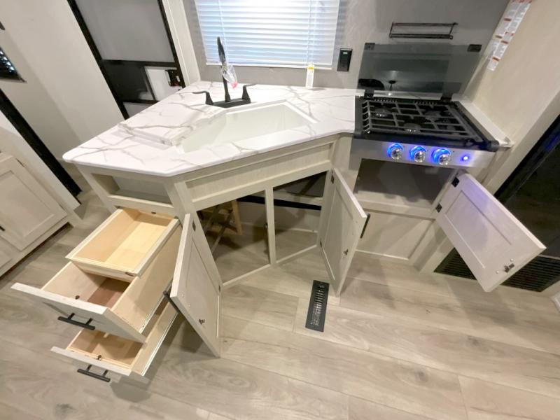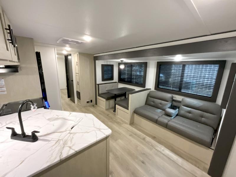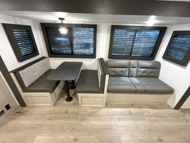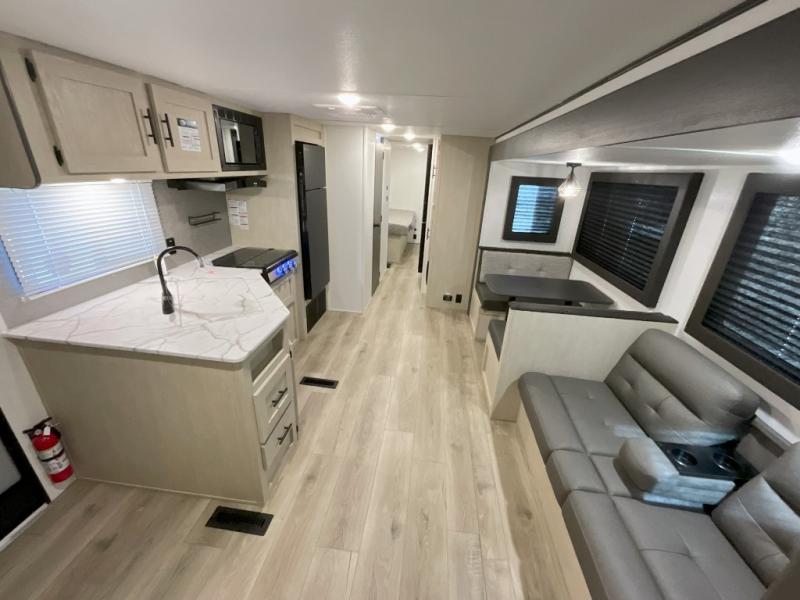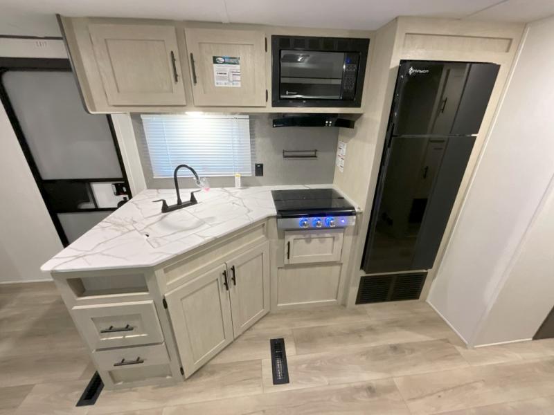 There are a a set of 38" x 74" bunks and a set of 26" x 74" bunks in this trailer for lots of sleeping space! This bunkroom also includes a slide out for more space, and you can choose the optional double suite with a 54" x 74" bed if you don't need the bunks. The kitchen is fully equipped for your camping trips featuring a three burner cooktop, an overhead microwave oven, a large sink, and plenty of storage space. You will also love the pantry for all of your canned goods and snacks. The bath features a 24" x 40" shower, toilet, and vanity/sink. In the front of this unit, a private bedroom provides a quiet retreat from the rest of the unit with dual entry doors, and you'll appreciate having dual bedroom wardrobes to keep your clothes organized. Outside, enjoy pass-through storage for all of your outdoor camping gear plus more.